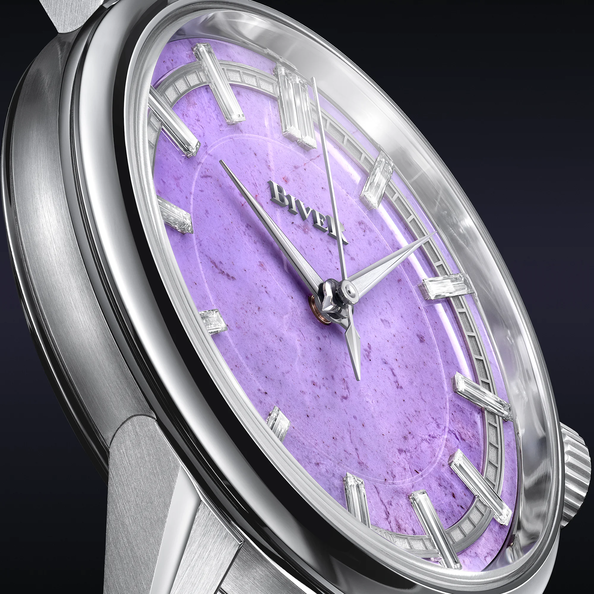 There are two other gold dials (one coated in blue) finished with brushing and Clous de Paris, in platinum or 18k rose gold cases, and lacking lume. Then, we move on to stone dials, which include blue quartzite (which can be purchased with 18k white gold, diamond, or blue sapphire indices) in a platinum case, lavender jade (with or without diamond indices) in a platinum case, mahogany obsidian in a rose gold case, or Oeil de Fer in a yellow gold case. Each comes with a thoughtfully matched leather bracelet with a pin buckle, but there’s an option to get the brand’s proprietary bracelet design, which blends a brick design with a bit of angularity.