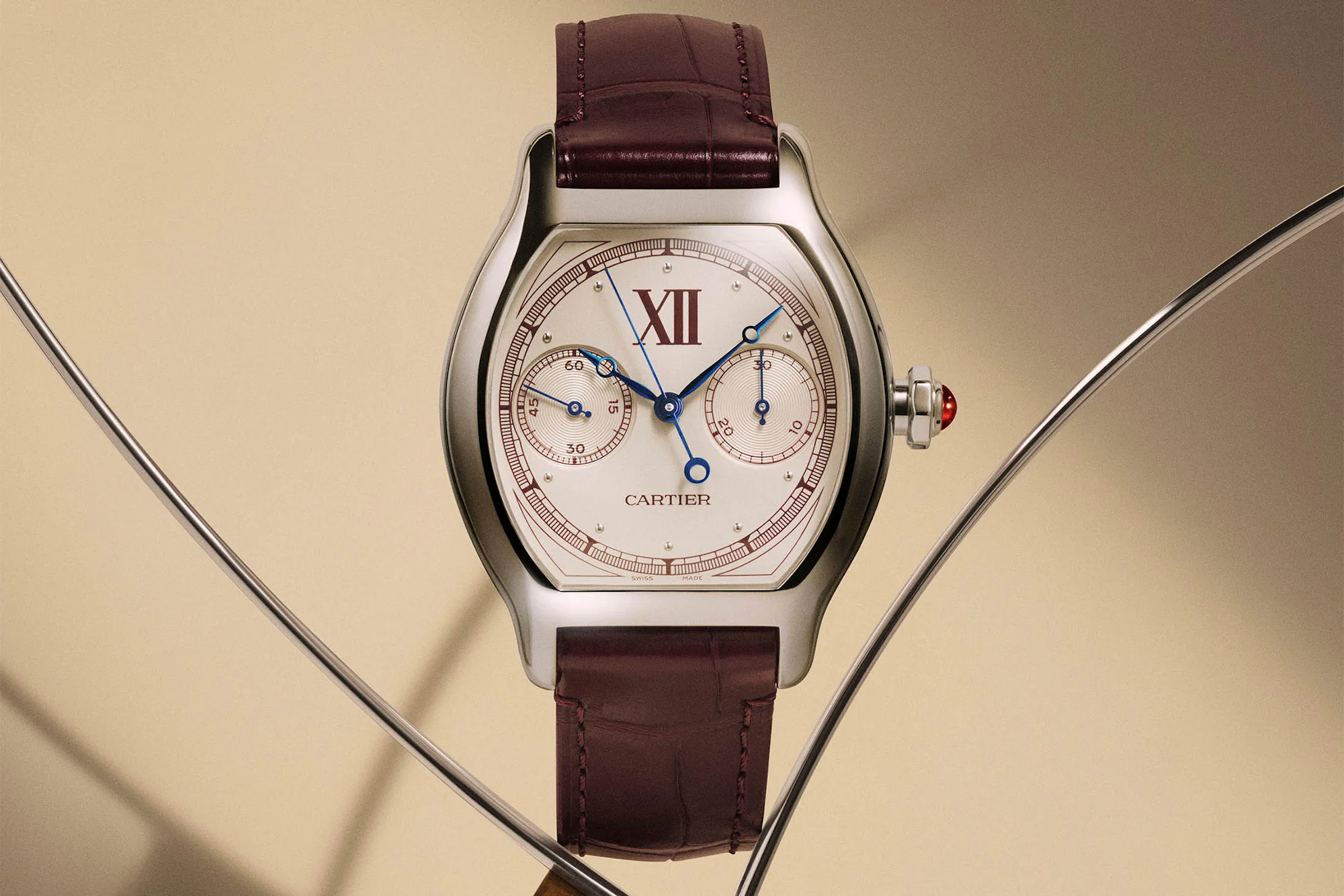 First is the Trio Exceptional, a collection of three iconic shapes: the Tank Normale, the Tortue Chronographe Monopoussoir, and the Crash Squelette. The three are executed in a familiar color scheme of burgundy accents paired with platinum, with a bit of additional color added thanks to the execution of hands in blued steel. The Tank Normale, brought back through the Privé collection in 2023, features the much-loved and rarely seen seven-row platinum bracelet, and this time solves prior complaints about legibility with the high-contrast hands.