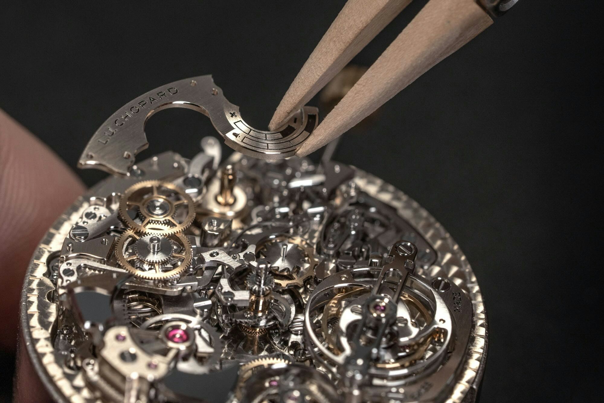 Last but certainly not least, the standout feature of the caliber is its chiming mechanism. The hammers sit prominently at 10 o’clock, but Chopard’s mastery in this area comes from using sapphire rather than steel for the gongs, producing an impressively loud and clear chime if you ever hear one in person. Their quality is further enhanced by the monobloc construction: the sapphire gongs are integrated directly into the dial crystal, allowing the sound to radiate outward without passing through any other material. The sapphire crystal itself also carries an engraved railway minute track.