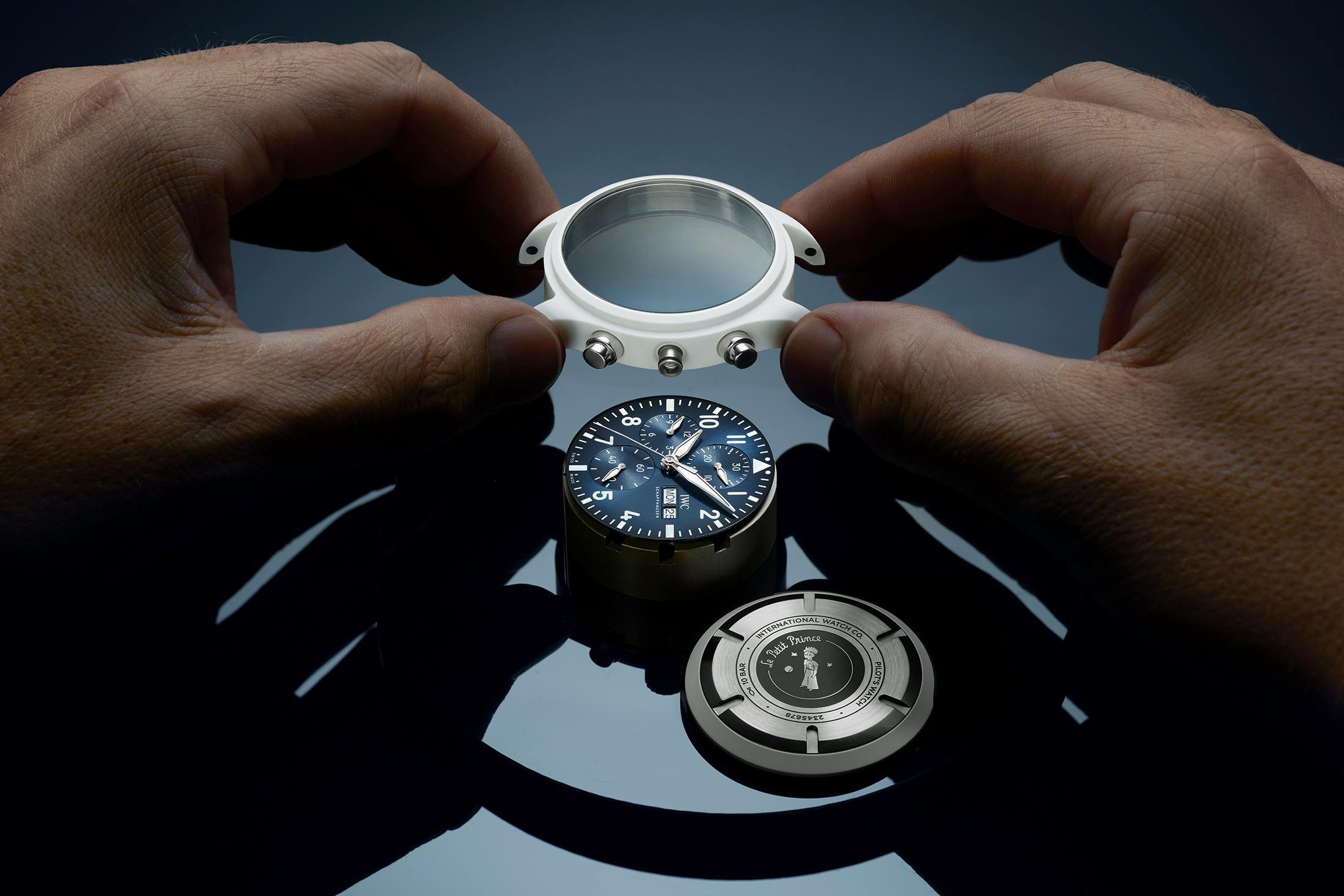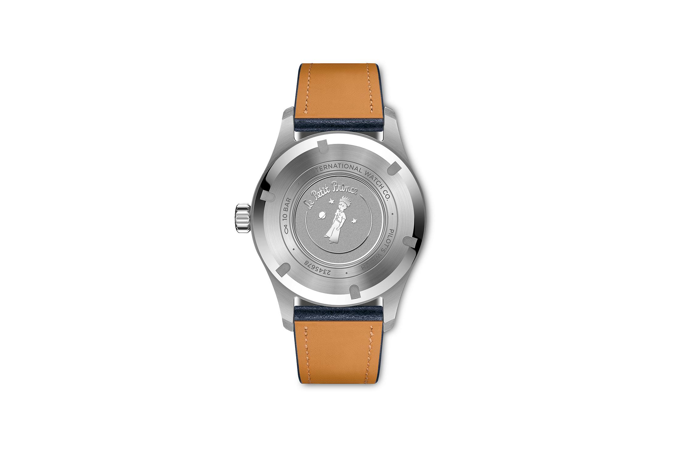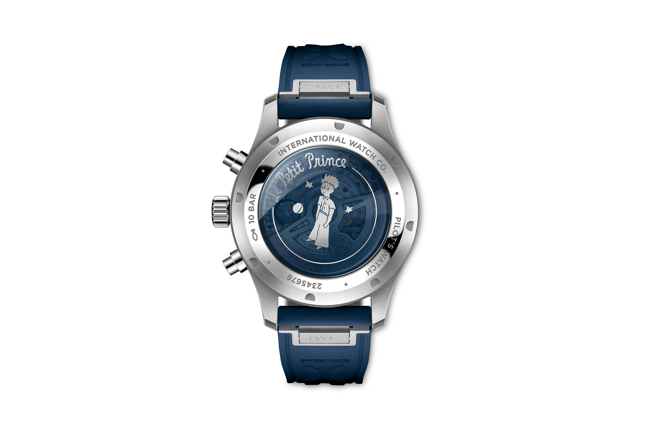 glass case with an illustration of the little interplanetary adventurer, as does the rose gold version. The stainless steel Mark XX and the ceramic chronograph have a solid caseback.