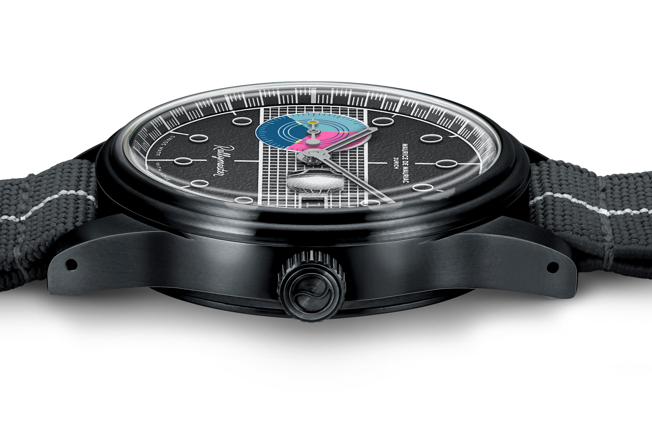 Design-wise, the Rallymaster IV represents a bold departure from the previous models, which leaned in to more traditional tennis colors, including pastel blue, pink, as well as grass-court green and beige. Check out our take on the Rallymaster III here. The fourth and final iteration features a brushed stainless steel case that uses a PVD coating to make it hipster black. The bright pink, aqua, and navy accents in the small-seconds subdial pop dramatically against the dial’s black and white net motif. This one’s for an aggressive net-rusher, or perhaps a cool pusher who just lobs back everything casually from the baseline.