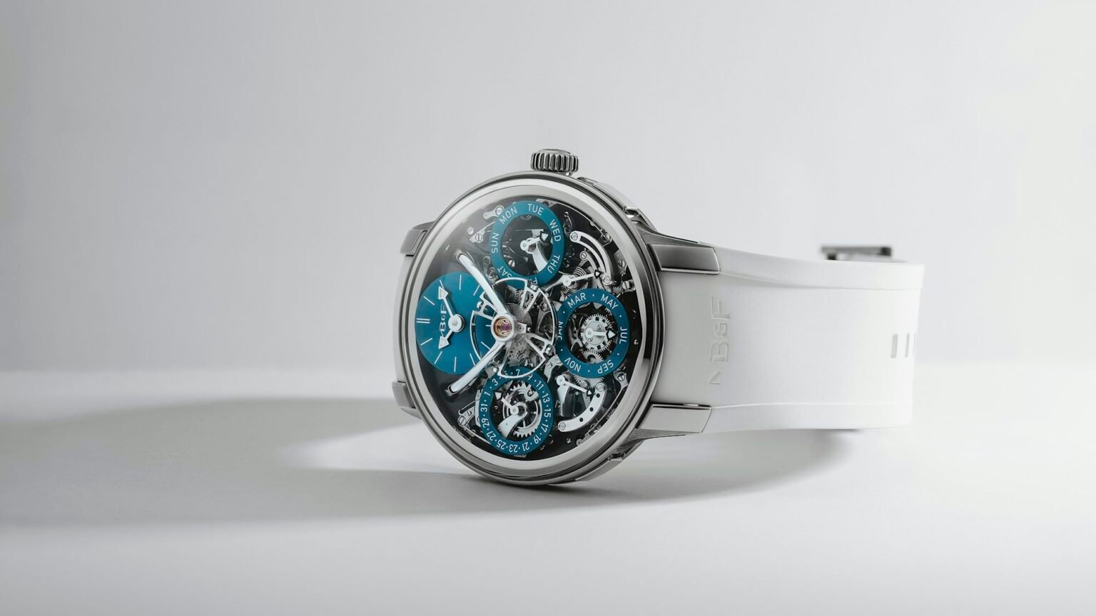 In doing so, the calendar doesn’t skip “redundant” days (as in most calendars), and therefore, there’s no possibility of the date jumping incorrectly. The date can be quick set with a pusher, and a safety prevents any risk of damage if the watch isn’t set correctly. The movement has 72 hours of power reserve and has MB&F’s signature flying balance beating at 18,000 bph.