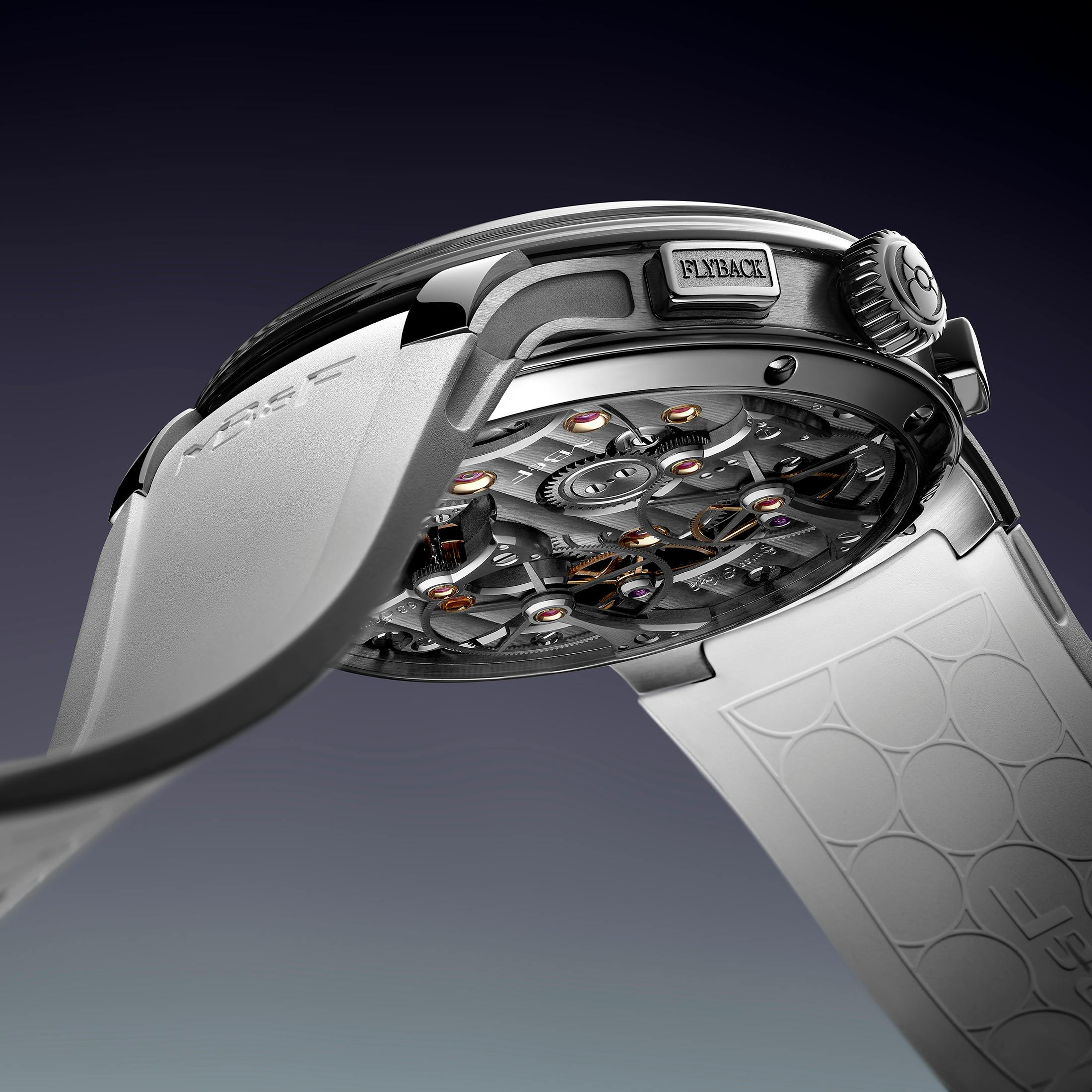 Functions: Hours, minutes, seconds, dual flyback chronographs, power reserve at rear, 60-second and 30-minute counters