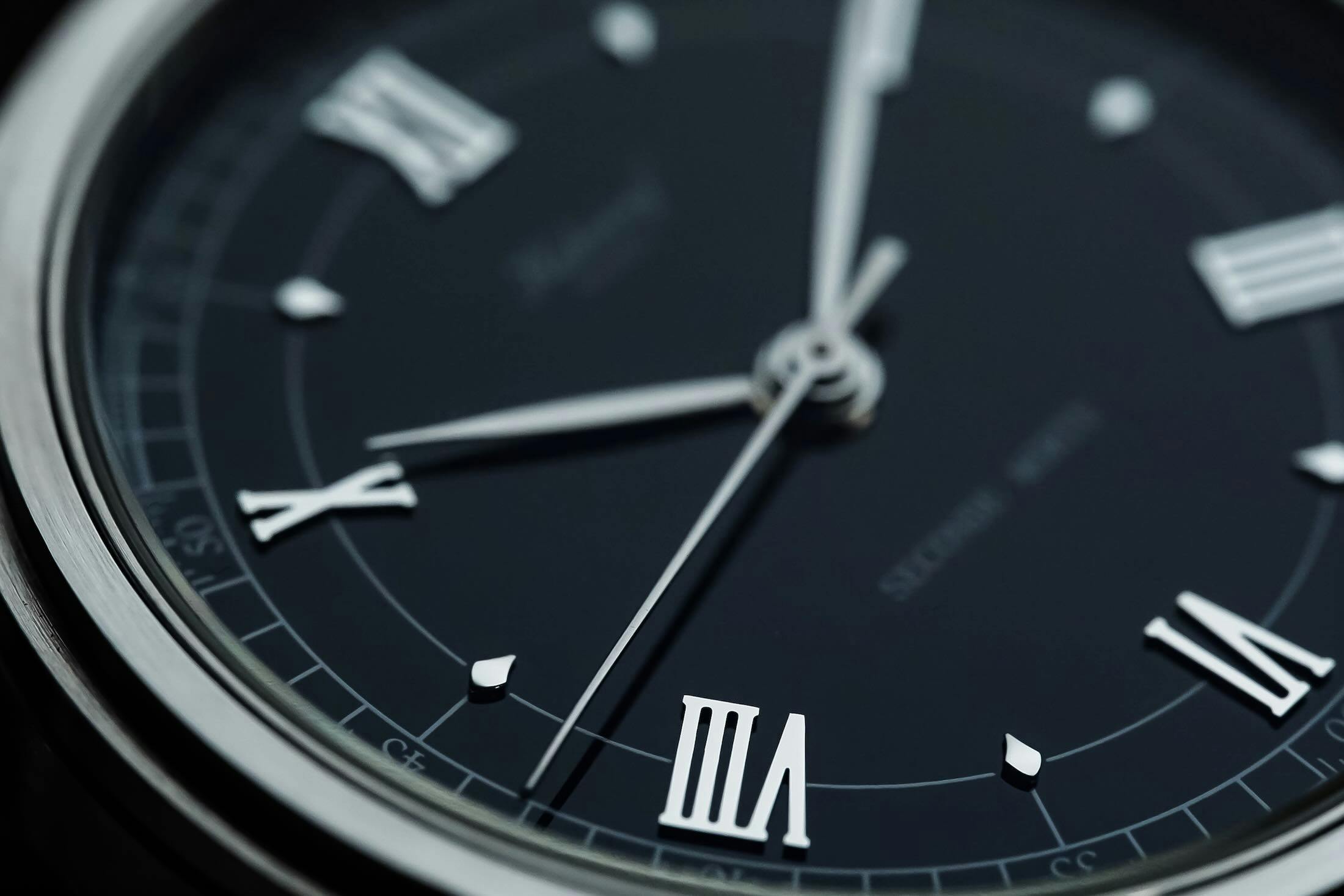 The dial of the Seconde Morte goes for a minimalist black-and-white color scheme, while adding just enough Art Deco touch for visual interest. Sitting on the glossy black dial are leaf-hands, applied Roman numerals, and diamond-shaped hour markers, which are fully polished for legibility. The rest of the dial accents, like the tracks, minute numerals, and logos, are all printed on the dial in flat white.