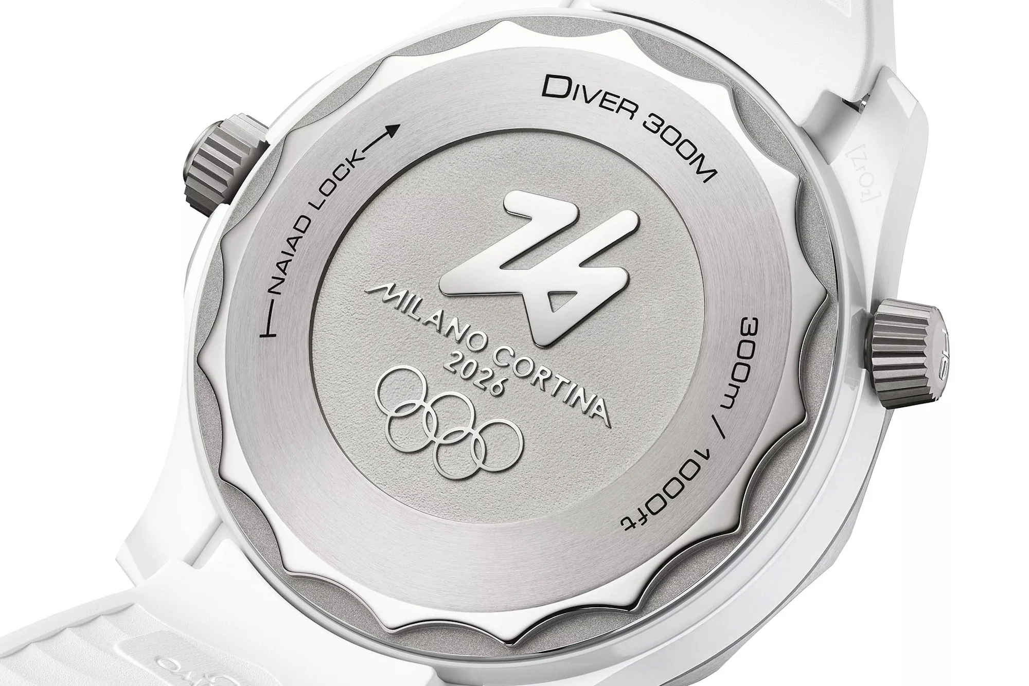 The final piece of ceramic is the dial itself, with a white ceramic disc laser-engraved for a frosted look. Mimicking the effect of tracing your finger on a frosty window, a zig-zag of polished white ceramic that contrasts with the frost is said to be abstractly inspired by the “26” of the Milano Cortina 2026 emblem. Printing on the dial is done in dark blue, while the seconds hand is coated in a gradient blue from light to dark. The automatic Co-Axial Master Chronometer Calibrer 8806 lies inside, with a power reserve of 55 hours and METAS certification.