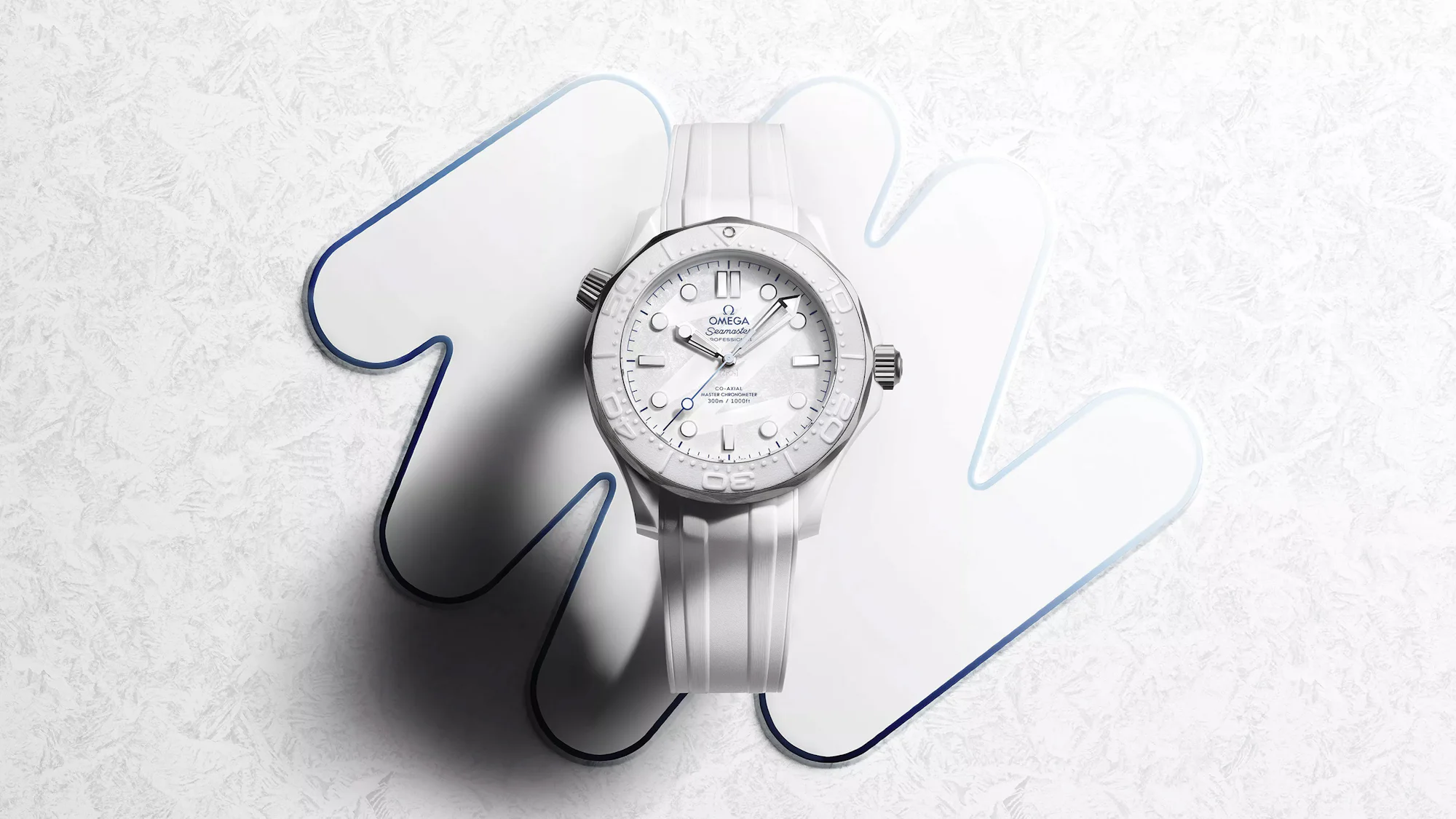 The edition takes the form of Omega’s ceramic-and-titanium diver, this time rendered in white ceramic for a bright, frosty look. While the silhouette will be familiar to anyone who knows the Seamaster 300M, the ceramic-and-titanium variants are slightly upsized, measuring 43.5mm in diameter and 14.37mm thick.
