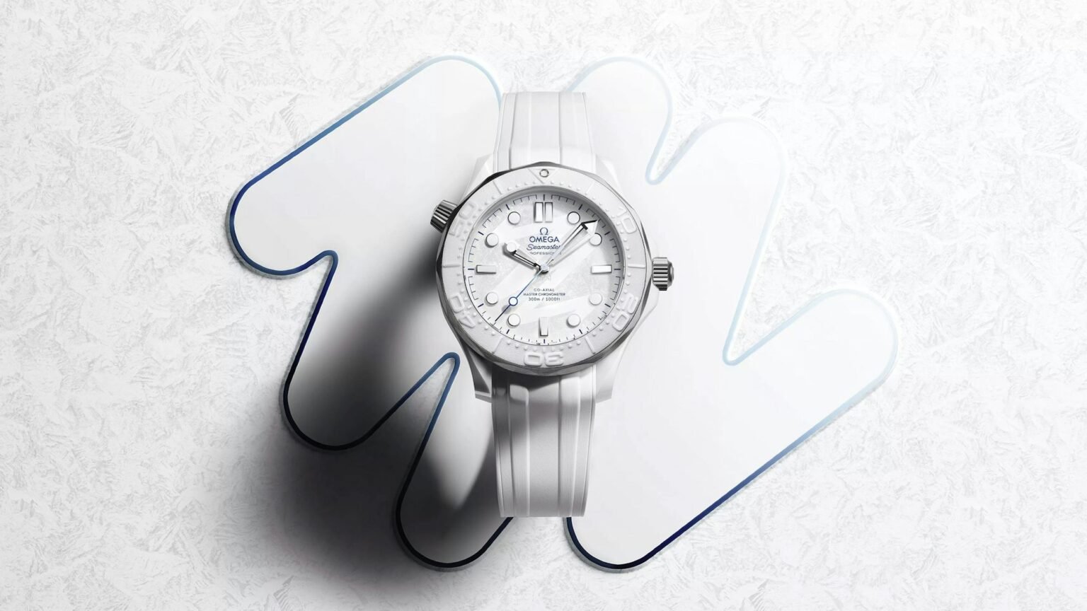 The edition takes the form of Omega’s ceramic-and-titanium diver, this time rendered in white ceramic for a bright, frosty look. While the silhouette will be familiar to anyone who knows the Seamaster 300M, the ceramic-and-titanium variants are slightly upsized, measuring 43.5mm in diameter and 14.37mm thick.