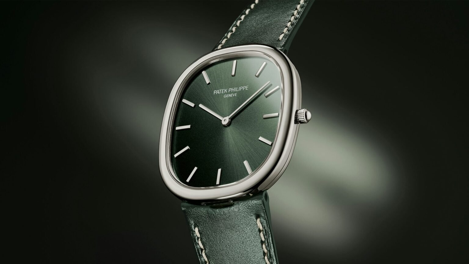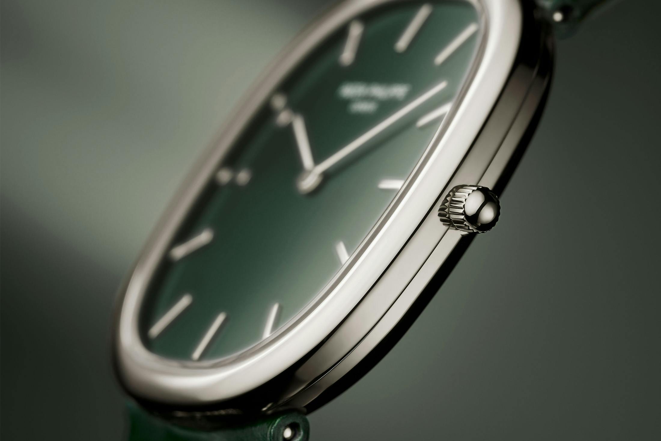 Patek Philippe has expanded the Golden Ellipse collection with two new white gold references, the Ref. 5738G-001 in the larger “Jumbo” format (34.5 × 39.5 mm) and the return of the Ref. 3738 in its more traditional proportions (31.1 × 35.6 mm). Both watches are defined by a new olive-green sunburst dial and framed by the harmoniously proportioned white gold case inspired by the Golden Ratio. Applied white gold baton markers and slender hands keep the dial in line with the Ellipse’s long-established codes, unchanged since its introduction in 1968. Both models are, of course, ultra slim, coming in at just under 6mm thick.