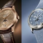 Both references are powered by the ultra-thin self-winding caliber 240 with a 22k gold micro-rotor, allowing for a total case thickness of just under 6 mm. The watches are fitted on olive-green calfskin straps with cream contrast stitching and white gold pin buckles.