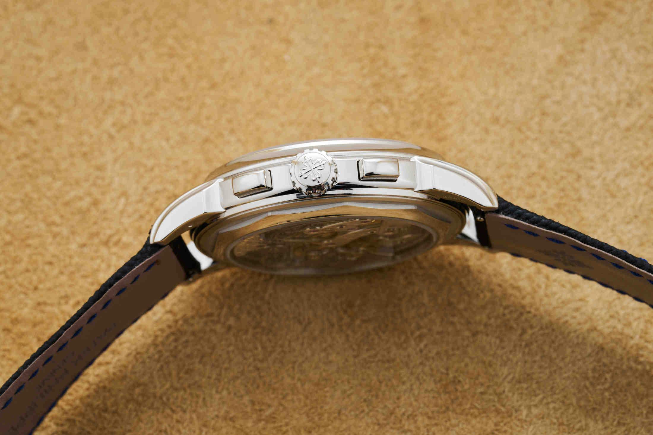 First, for the 5236P in-line QP, the watch, with its platinum 41.3mm by 11.07mm case—housing the 31-260 PS QL caliber movement with automatic winding and 48 hours of power reserve, moonphase, and perpetual calendar—is now capped with a very surprising grey dial.