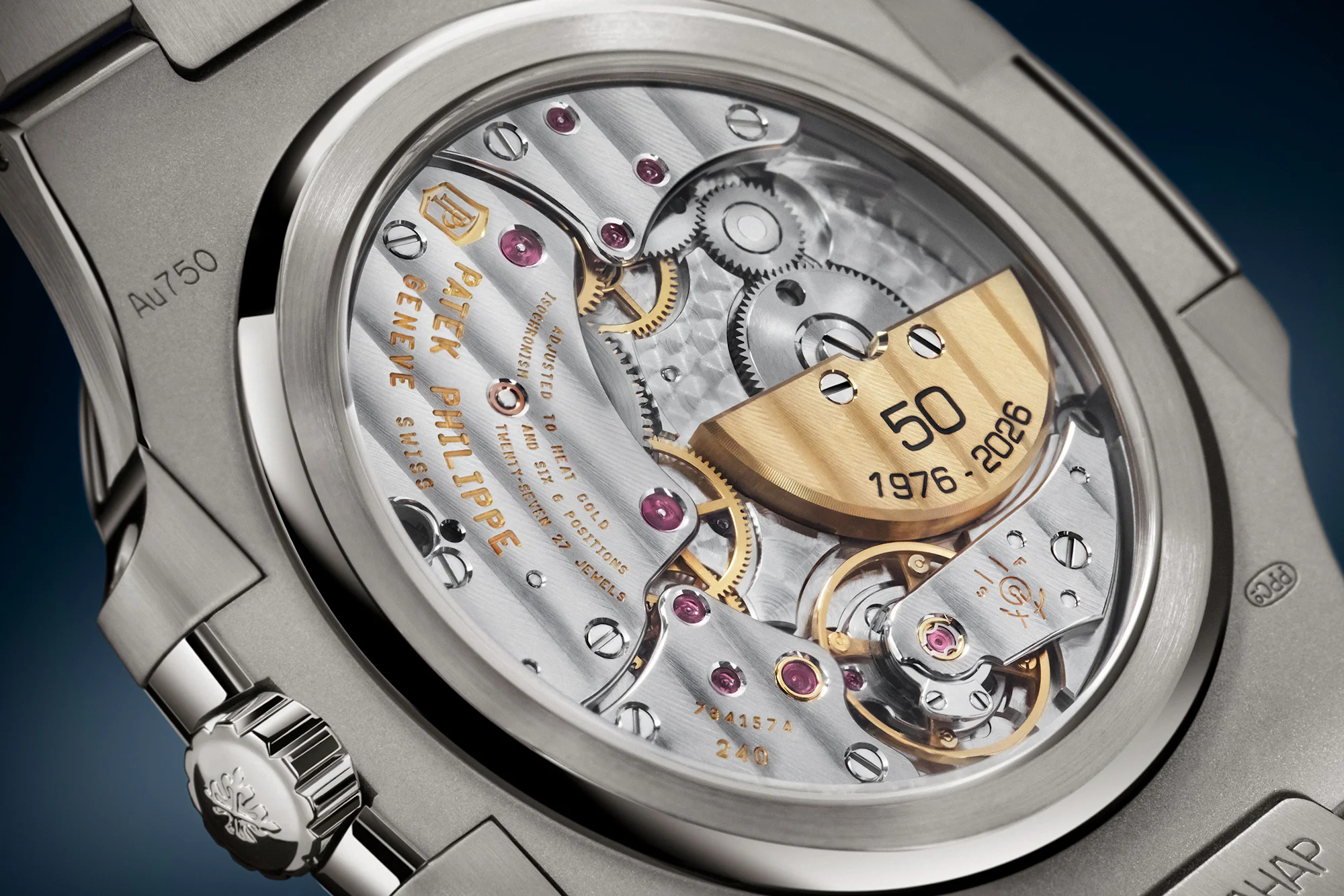 Unlike the embossed anniversary dials of the 40th Anniversary, the Caliber 240 micro-rotor movement (launched one year after the Nautilus in 1977), has the numbers “50 1976-2026” engraved in the 22k rotor to celebrate the anniversary. The movement is only 2.53mm thick, and it has 48 hours of power reserve, with a Gyromax balance stud and Spiromax balance spring (in Silinvar). The watch is water resistant (as are almost all Pateks) to 30m.