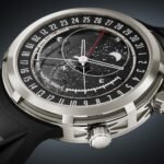 Last but not least, in production numbers only, there is also a wild Patek Philippe desk watch in a 50.65mm white-gold case that’s 13.5mm thick. On the dial side, you have a very traditional Nautilus motif with baguette hour markers, a power-reserve indicator, date, day, and running seconds. The case itself, with a bow inspired by the Nautilus case shape, can stand up on its own caseback hinge. The case has a built-in dust cover that supports the sunburst decoration beneath its blue PVD coating. The caseback has Nautilus horizontal-relief embossing and an applied Calatrava cross in 18K white gold with a satin-brushed finish.