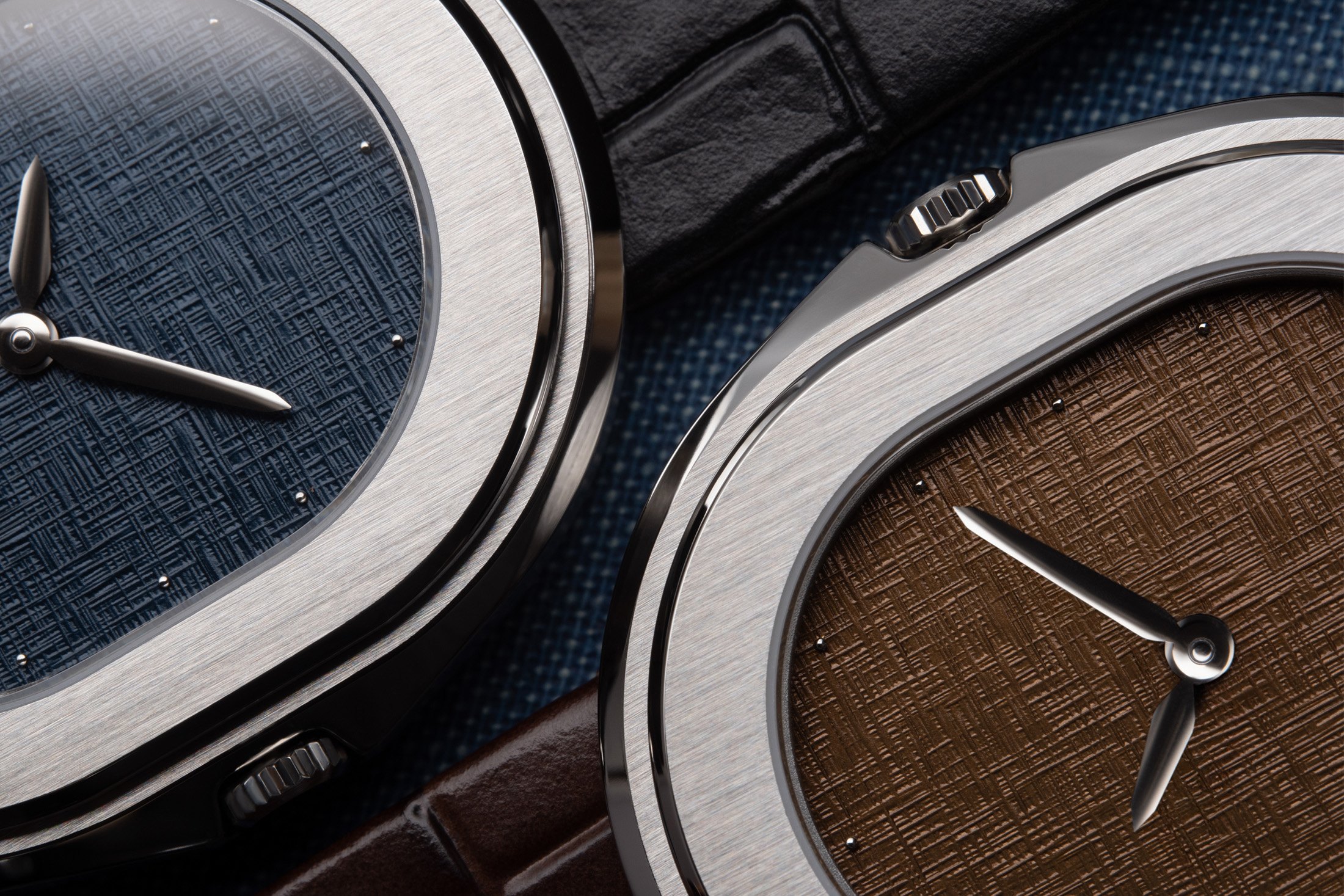 These new iterations are essentially just new dials, so the Linen Parade models offer the same physical form as the preceding launch models, measuring 35 mm × 41 mm × 8.2 mm and featuring a lug-less stainless-steel “stadium” case shape. Despite its slim profile, the 1174 offers 100m of water resistance, achieved thanks to a design in which screws pass through the entire case and connect to the underside of the bezel. The bezel and vertically brushed, and both of the dials (brown for Tobacco and blue for Slate) are largely text-free and set with tiny cylindrical hour markers.