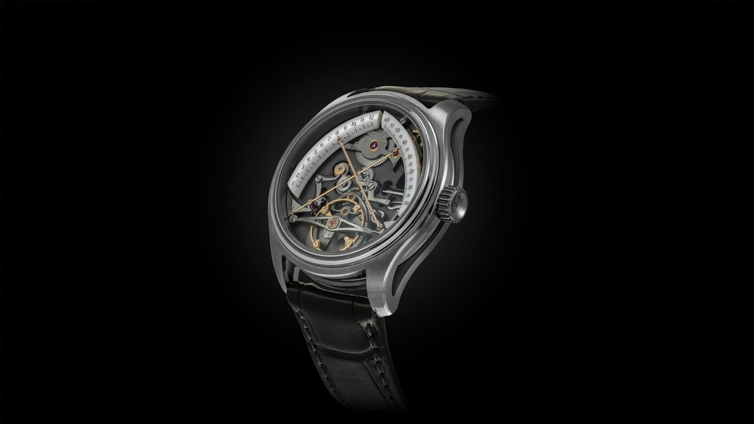 The souscription series, limited to 15 pieces, was made of rose gold and zirconium, while the 50-piece current model is made of grade 23 titanium and measures 39mm by 10.8mm (12.2mm with the crystal). The lugs are machined as a single piece around a central container for the movement. The design leans heavily on the impressive double-retrograde display, with overlapping 20mm hands pointing to 19mm-long, curved, white ceramic retrograde displays. The minute hand creeps along while the hour hand jumps every hour, then returns every 12 hours. There’s also a running seconds display at the rear of the watch and a hand indicating the power reserve (which can also be read via a red cone jewel on the front).