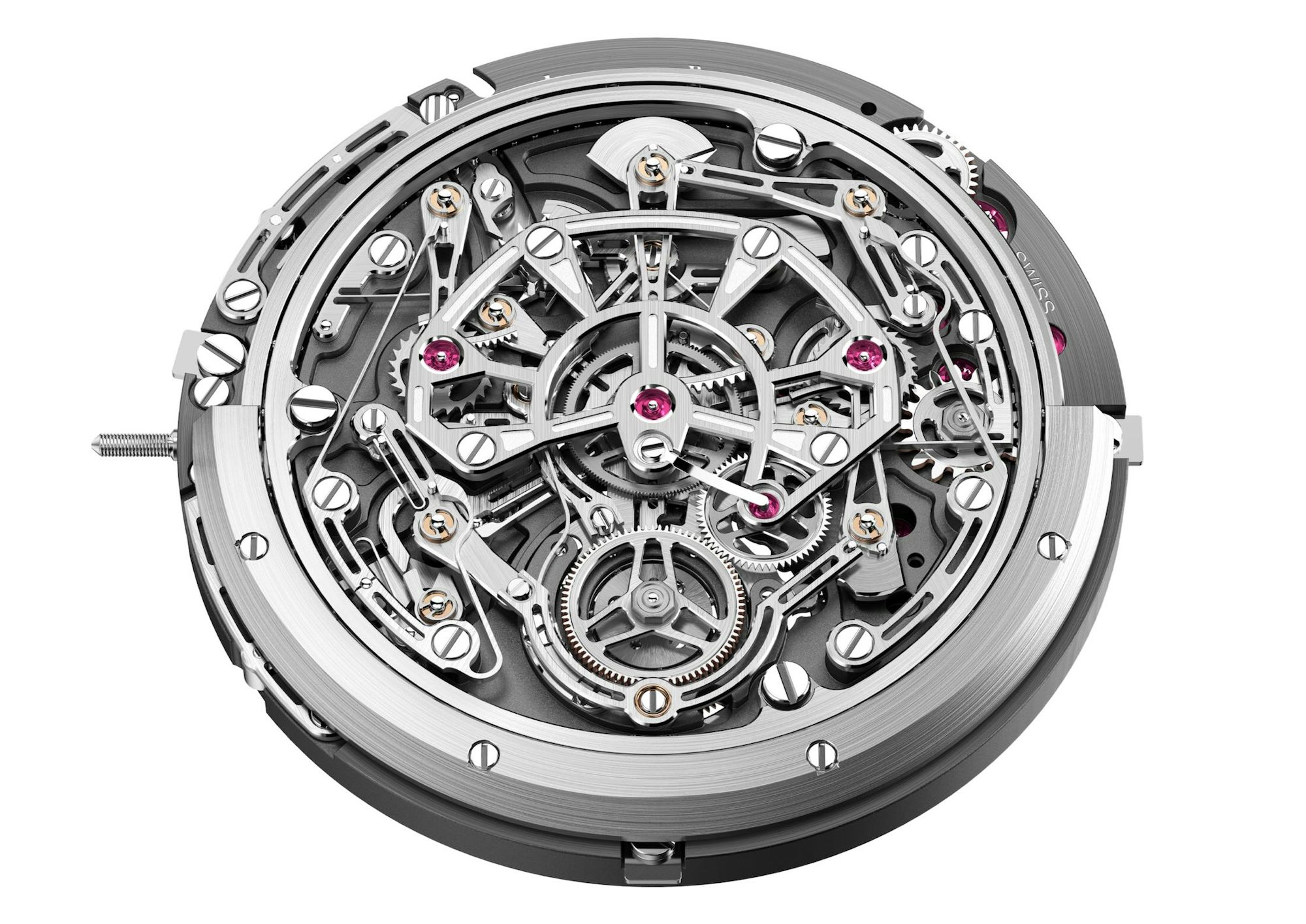 This design also enables the flyback and reset to occur with a light press of the pusher, requiring virtually no force. When the pusher is pressed, the racks disengage and return to zero using the energy that was already stored. The reset takes less than 0.15 seconds, partially thanks to chronograph hands and movement components made out of titanium, one of the more challenging materials to machine for parts in a caliber.