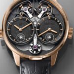 It seems like a perfect send-off to the MR model, the brand’s classic 36mm by 9.9mm classic dressy option, which will be discontinued in its current format after a four-year run. In addition to the lab-grown moissanite baguettes in the bezel, the watches feature new glossy black dials (with a brushed sector in the Roulette’s dial), one with leaf hands and Breguet numerals, and the other with that printed roulette design and faceted dauphine hands.