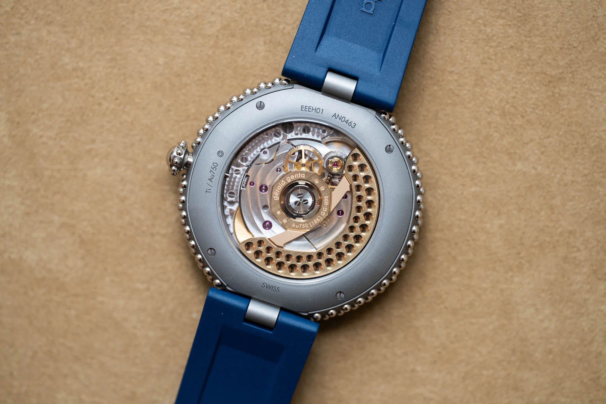 Beating inside these urchins is the same caliber as the other iterations: the Zenith Elite GG-005 caliber, borrowed from one of LVMH’s other portfolio brands. The same dimpled rotor design in yellow gold is seen here, though given the larger case, the movement feels smaller in these models. It beats away at 4 Hz and offers a power reserve of 50 hours.
