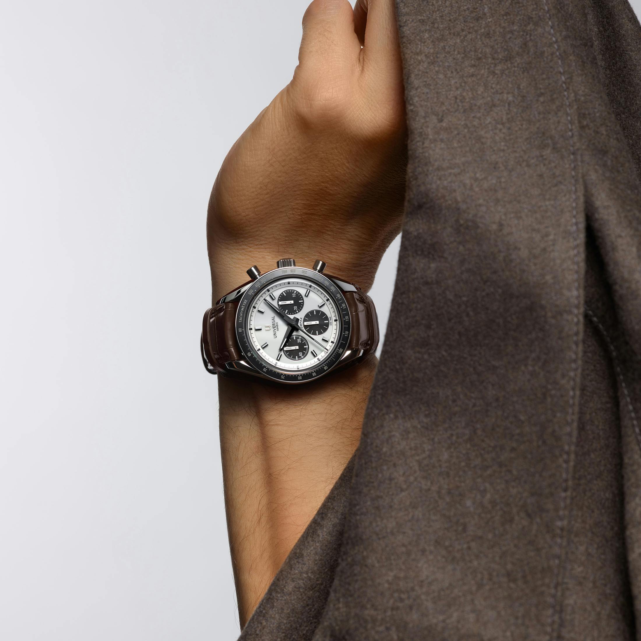 The version of the Compax that UG chose to restart their brand with actually comes later in the brand’s history, when they had moved on from their in-house movements (in this watch, at least) to the manual-wind Valjoux 72 column-wheel chronograph movement. The larger watch, with a white dial and black subdials (a “panda” chronograph), was made an icon by an unexpected acolyte. Finnish model Nina Rindt wore the watch trackside at Formula One races, timing her husband Jochen Rindt’s laps. And now, the “Nina Rindt” is back, with a sunburst-finished dial, alongside five other versions of the Compax, with several improvements.
