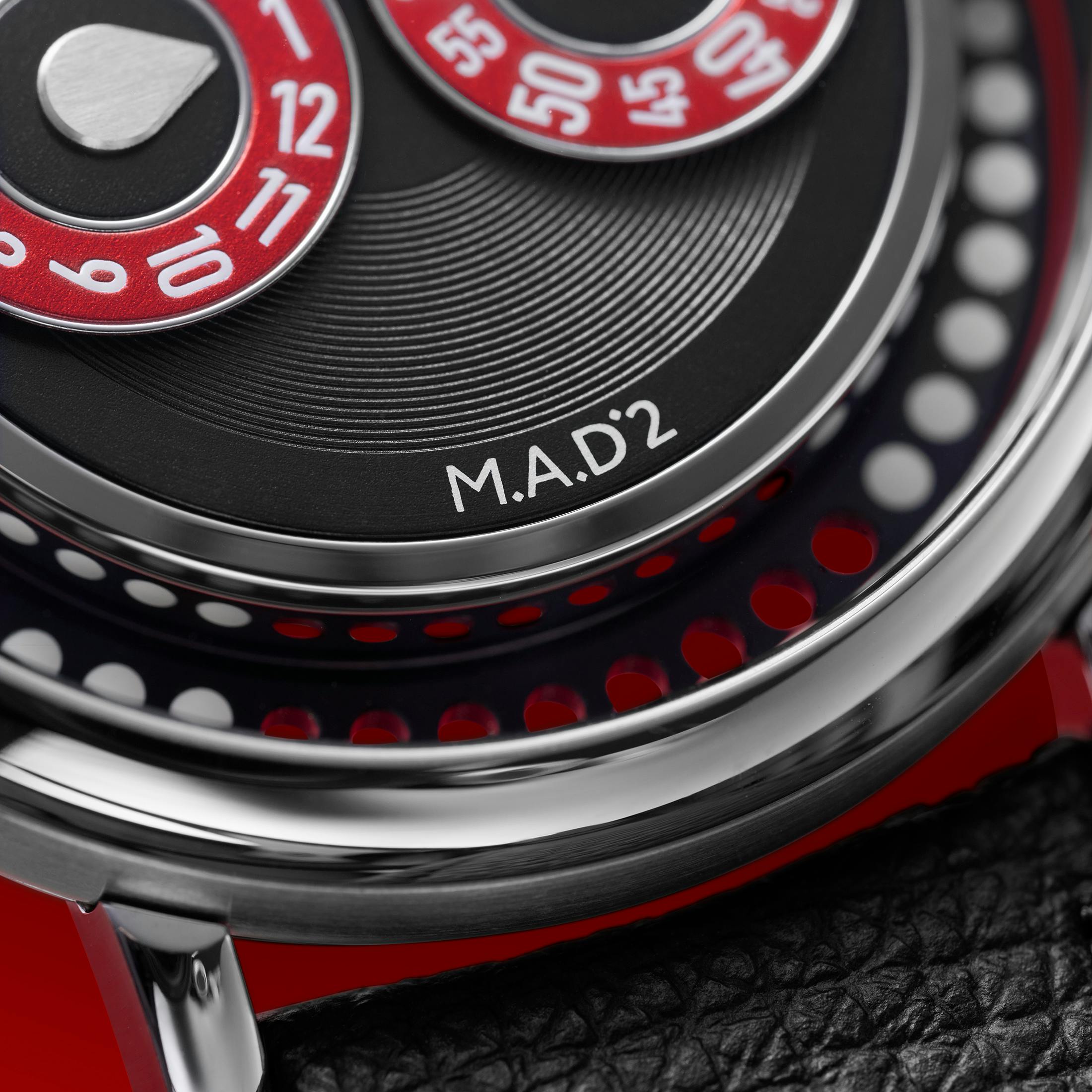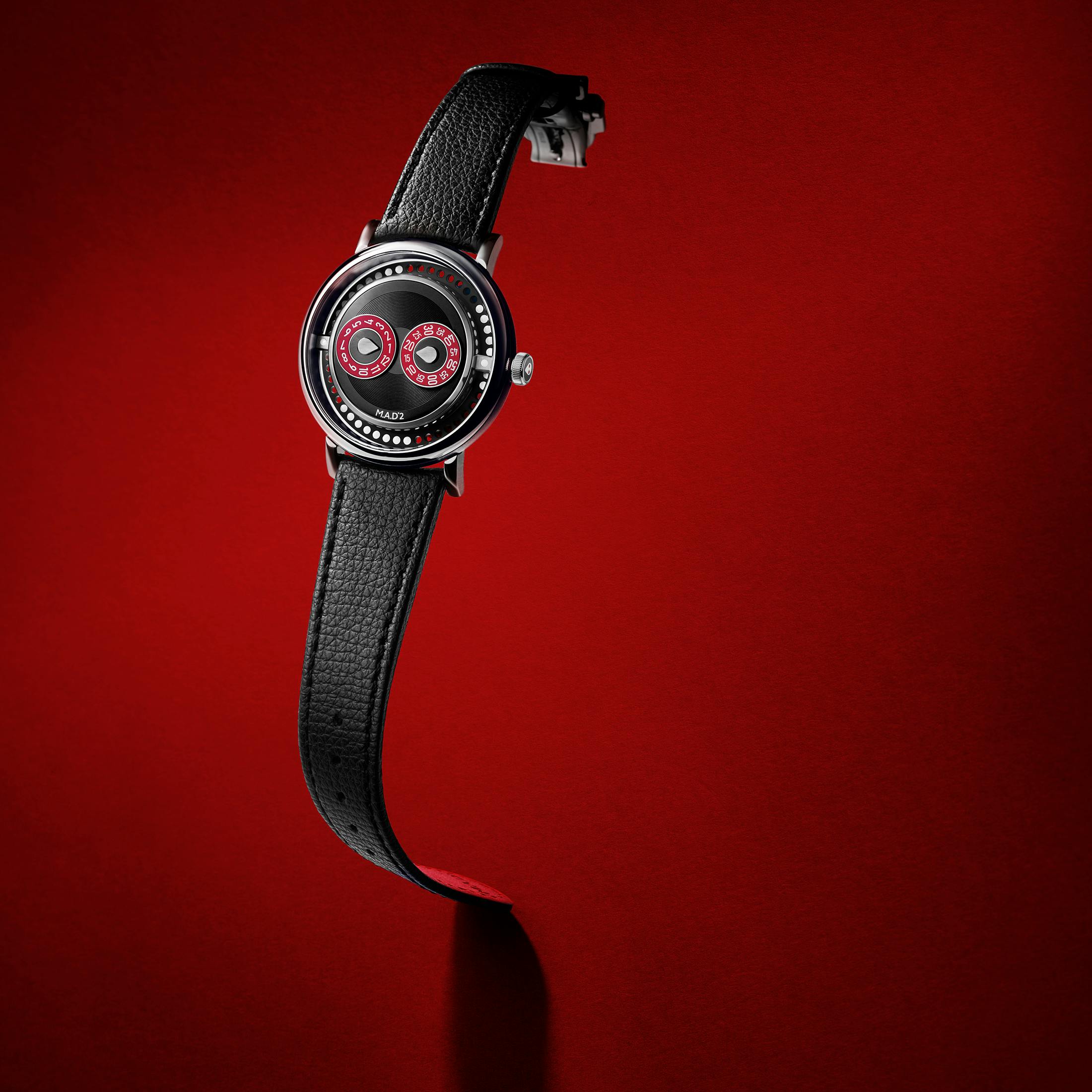 The idea is back now with the M.A.D.2 series, which was designed by Eric Giroud and inspired by his love of 1990s club culture and turntables. With a spinning rotor disc visible from the front and back, the M.A.D.2 REDemption, with a red dial plate and black rotor, black jumping hour, and trailing-minute disc, is available to “loyal but unlucky (until now) fans of the brand who have participated in at least four previous raffles without ever winning.” It’s complemented by a new M.A.D.2 R&B (red and black, not Sade and Usher) with a black dial plate that looks like a classic vinyl pressing and red discs for the time display.