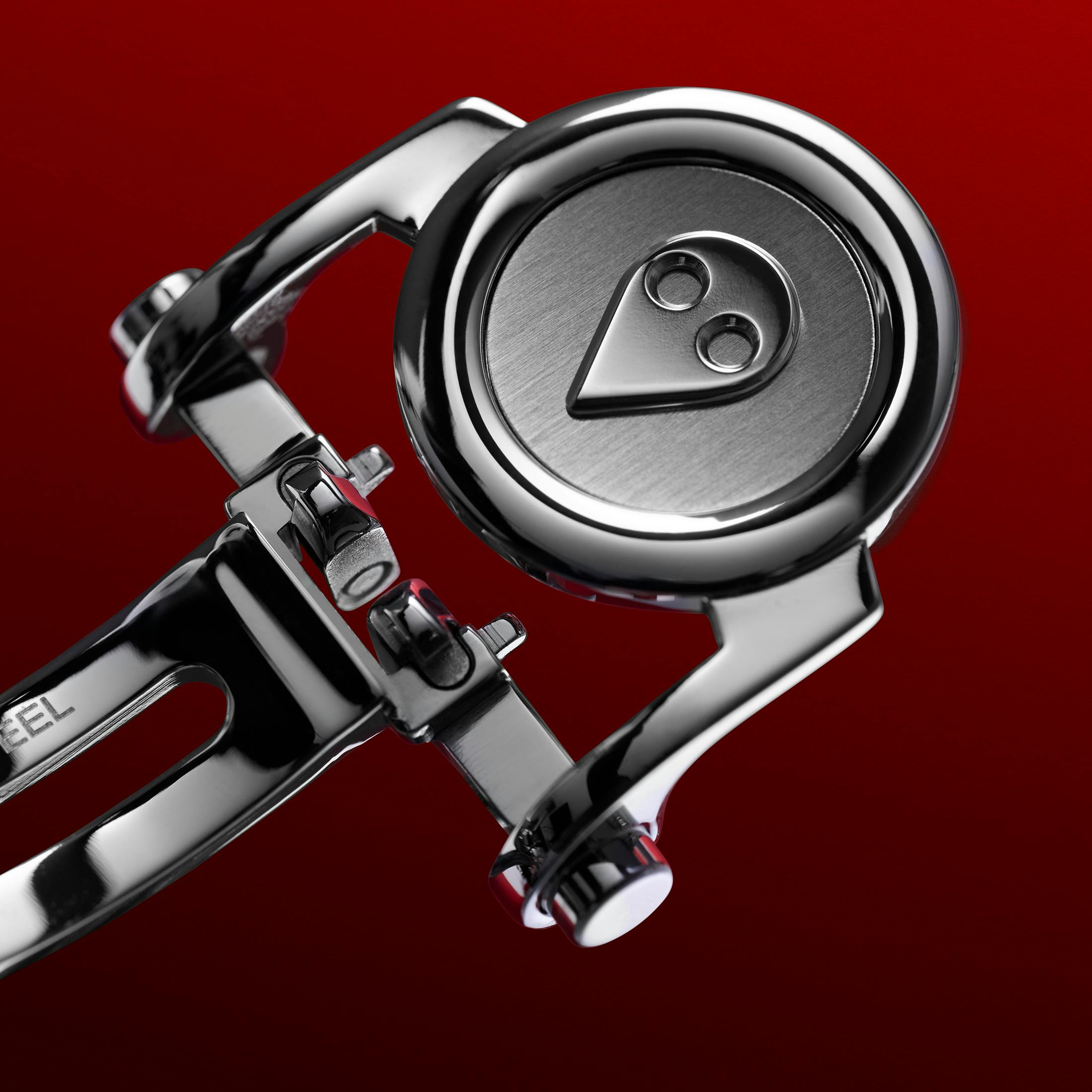The M.A.D.2 R&B (Red & Black) and REDemption is powered by the Swiss-made Manufacture La Joux-Perret caliber G101 with a 4Hz beat rate and 64 hours of power reserve. The entire thing is capped by a module made by MB&F that powers the creative display. The movement is much smaller than the case, so the extended rotor appears as a spinning disc, giving the impression of a spinning turntable. There is a detailing of the front’s indices carried over to the crown.