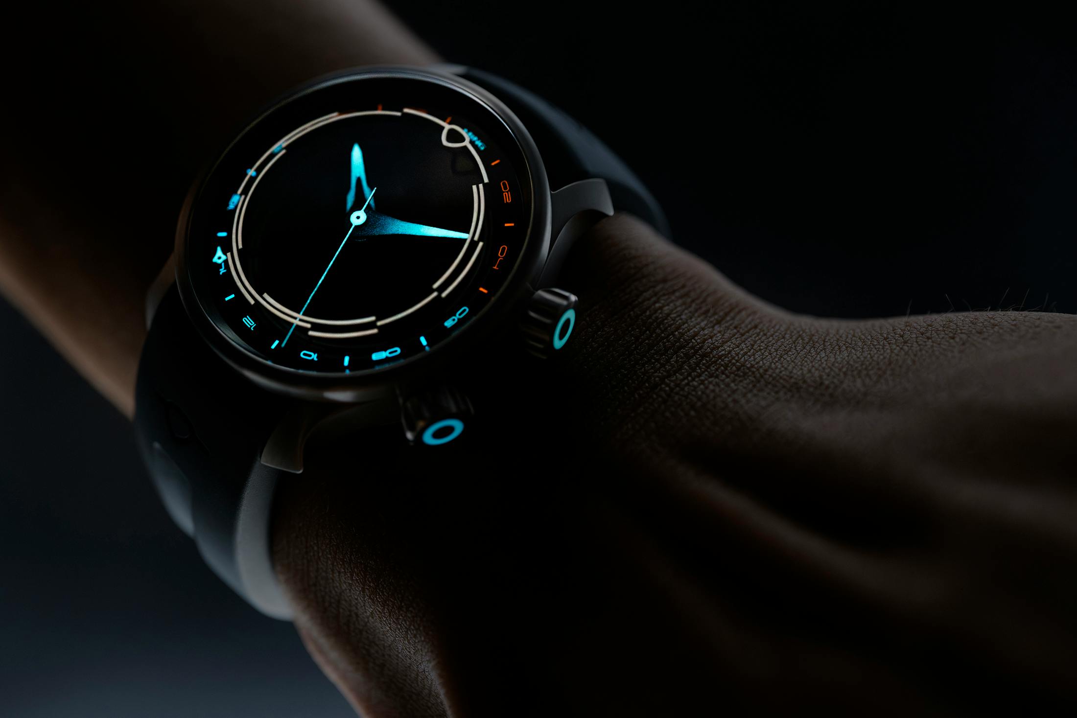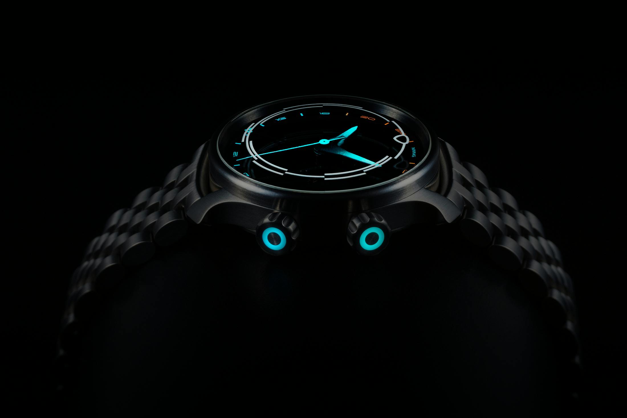 Lume: MING Polar White luminous hour indices in the top sapphire crystal; Super-LumiNova X1 indices on sapphire dial with blue and orange emission; Gradient Super-LumiNova X1 coated hands