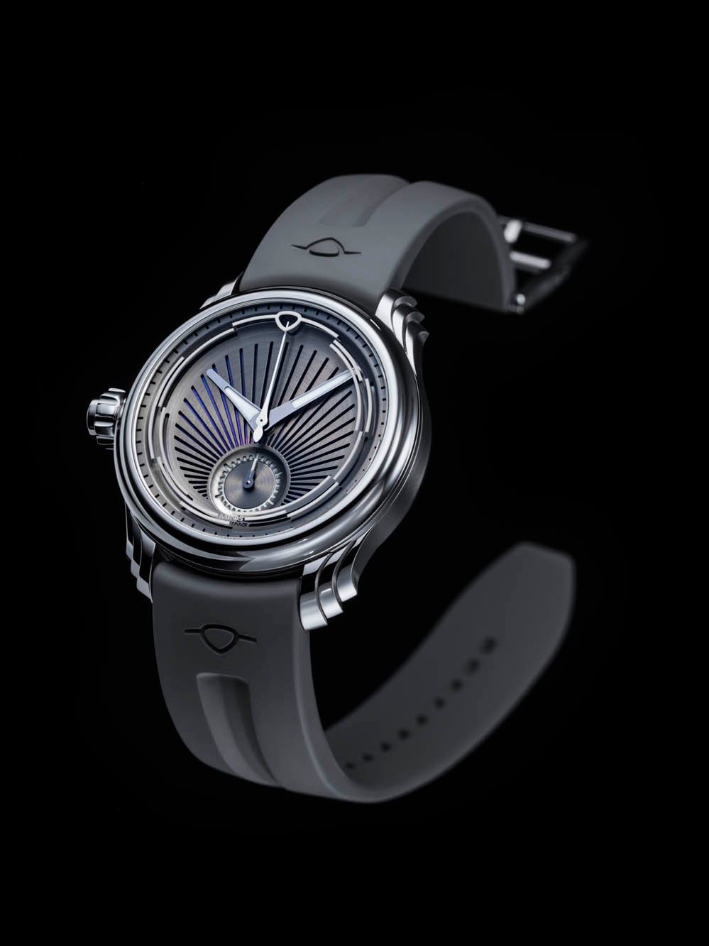 The case is completed by stepped lugs, which MING is proud to note takes nine separate pieces to create. The watch is paired with a grey FKM rubber strap or the ever-popular MING polymesh bracelet.