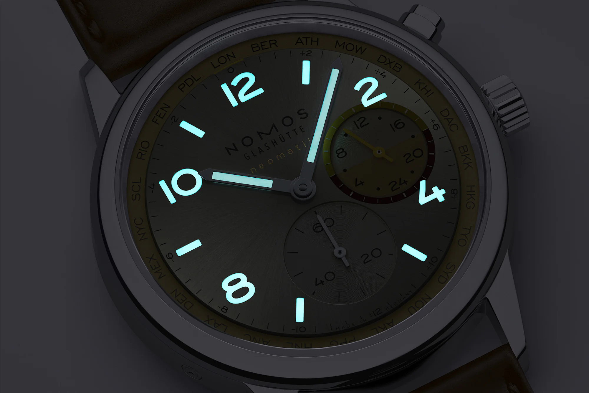 Inside both watches is the Nomos DUW 3202, an automatic worldtime caliber with a 24-hour display and a globe motif in gold visible through the rear sapphire crystal. The movement measures 31mm across and 4.8mm thick, with a 42-hour power reserve. Its architecture supports the signature Nomos worldtime mechanism, which presents 24 time zones at a glance (using +/- from the coordinated city at 12) and allows local time to be advanced via the pusher at two o’clock.