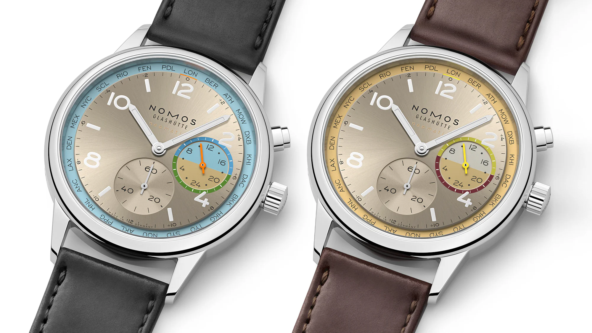 The world time roll-out continues for Nomos as the brand has just announced an additional pair of limited-edition executions of its still-novel Club Sport Neomatik Worldtimer. The new models, called Reverie and Roam, share a champagne-toned dial and the familiar city-coordinated layout but differ in terms of accent colors. The Reverie leans warm and understated, while Roam takes on a cooler, more sporting palette. Together, they represent the 10th and 11th limited iterations of Nomos’ new travel model, joining the original six LEs launched at Watches and Wonders back in April and the “Night Navigation” LE trio launched this past September.