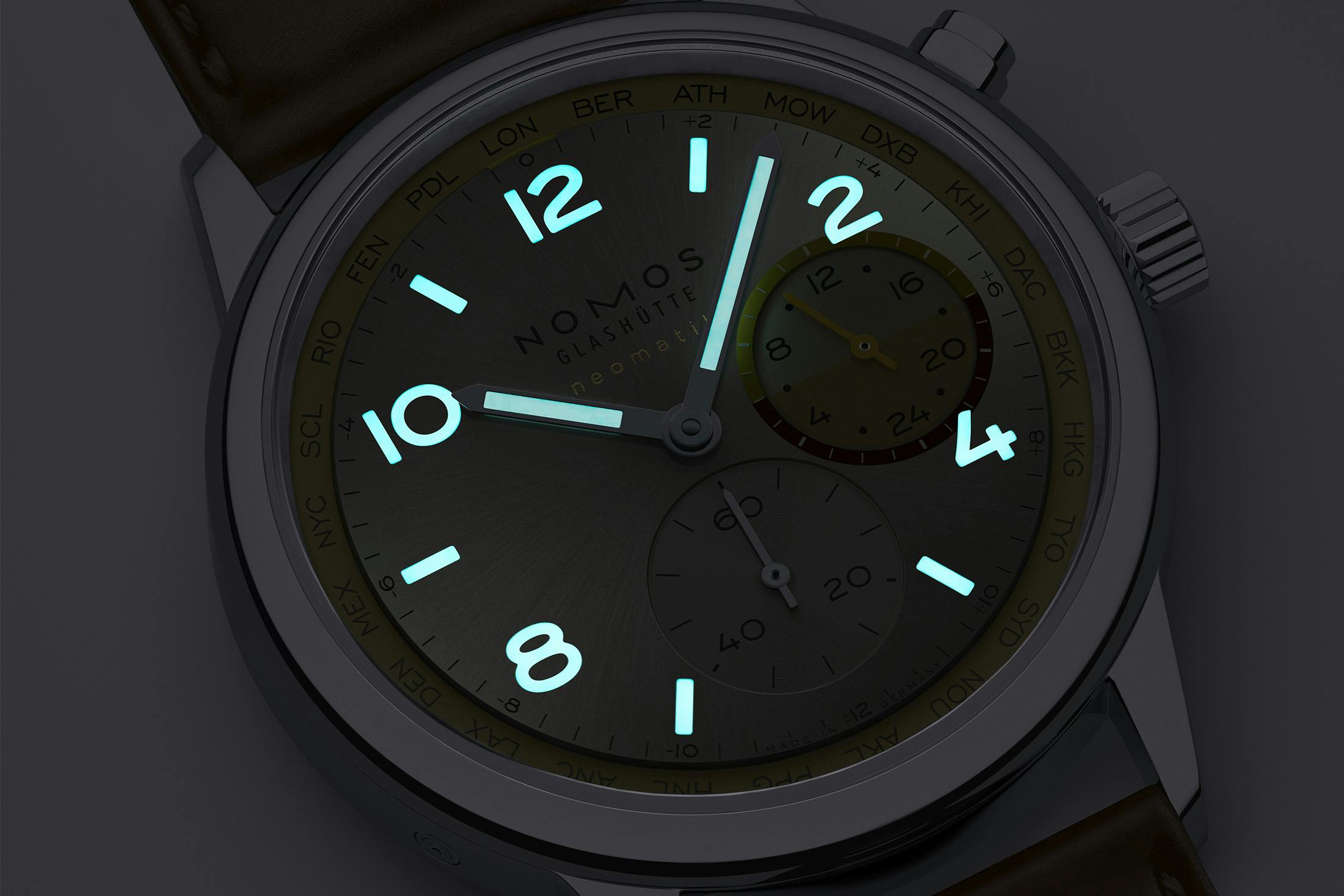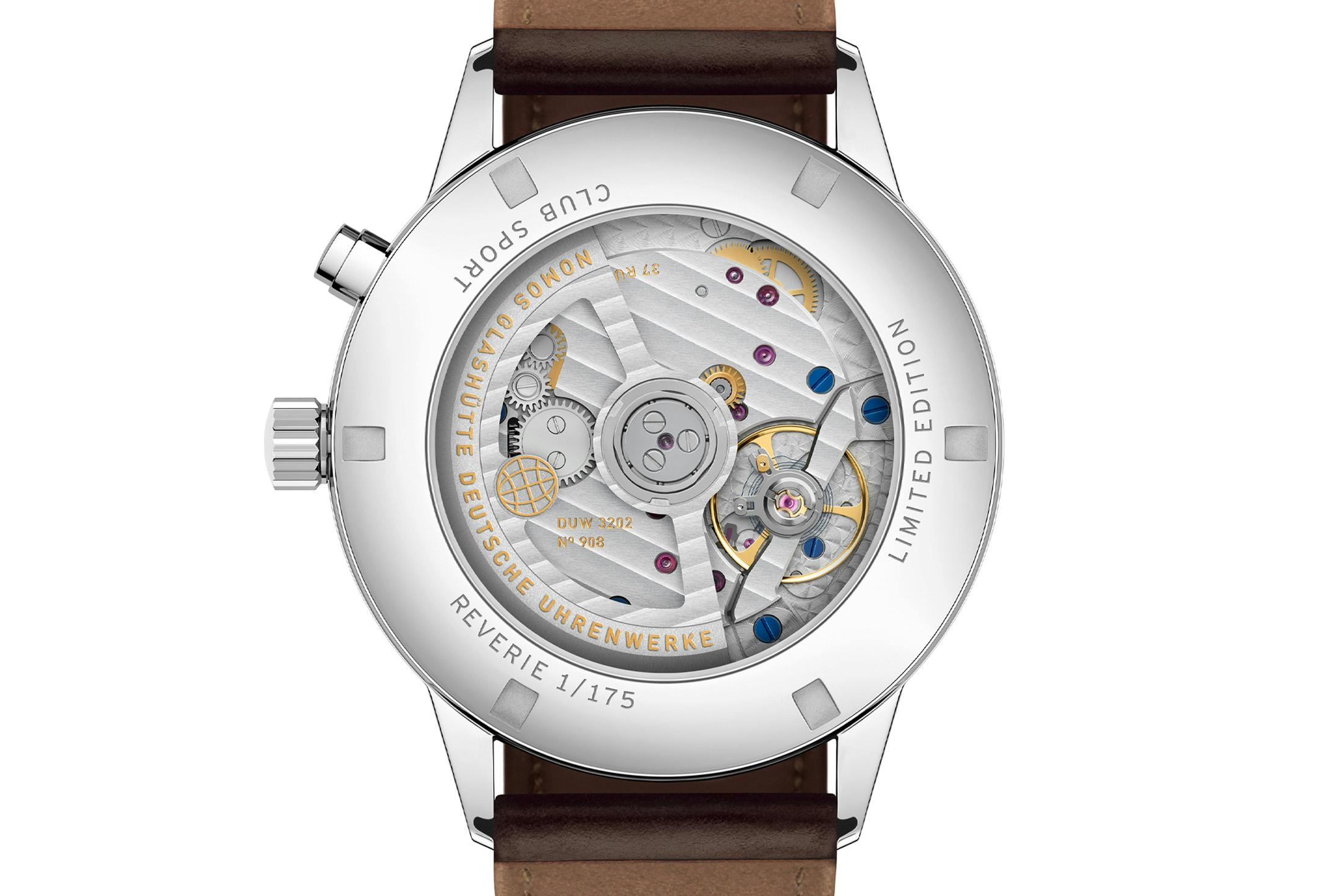 Inside both watches is the Nomos DUW 3202, an automatic worldtime caliber with a 24-hour display and a globe motif in gold visible through the rear sapphire crystal. The movement measures 31mm across and 4.8mm thick, with a 42-hour power reserve. Its architecture supports the signature Nomos worldtime mechanism, which presents 24 time zones at a glance (using +/- from the coordinated city at 12) and allows local time to be advanced via the pusher at two o’clock.