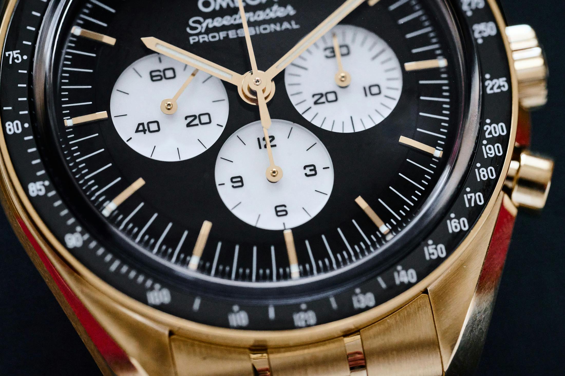 The Omega Speedmaster Professional Moonwatch Black & White is available now in the standard catalog, priced at $10,400 for the steel model and $49,300 for the Moonshine Gold model.