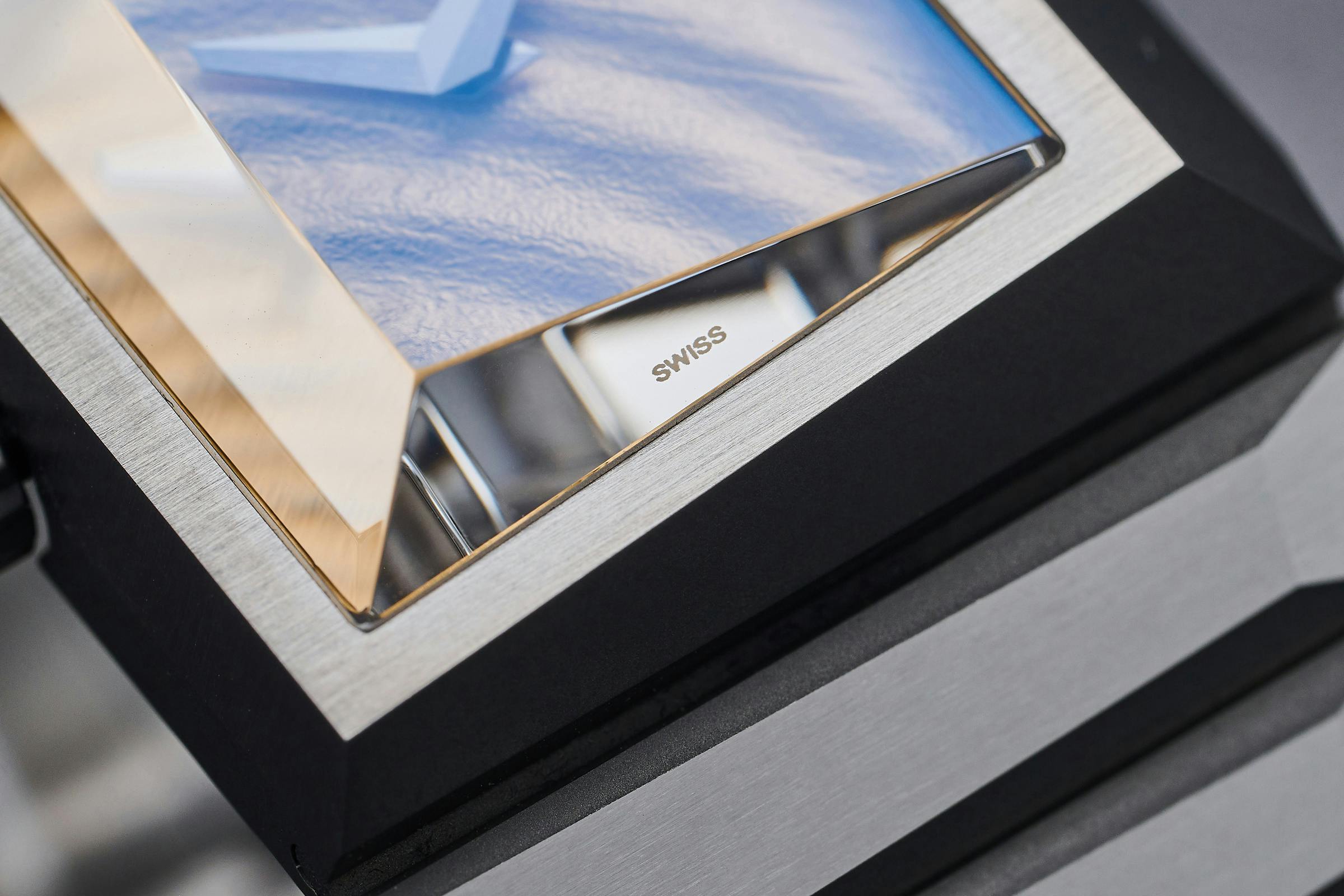 First, the watch’s width has been downsized from 33.5mm to 32mm, which is a bit of a surprise in an era when watches seem to be getting bigger and bigger yet again. The weight has been reduced by the titanium case and bracelet (as frequently requested in our original story’s comments). Thickness varies from 8.8mm (without the crystal, at the thinnest point) to 10.8mm (at the thinnest point of the crystal) to 12.4mm at its thickest, due to the inclusion of the faceted, angled sapphire crystal that wasn’t in the first release.