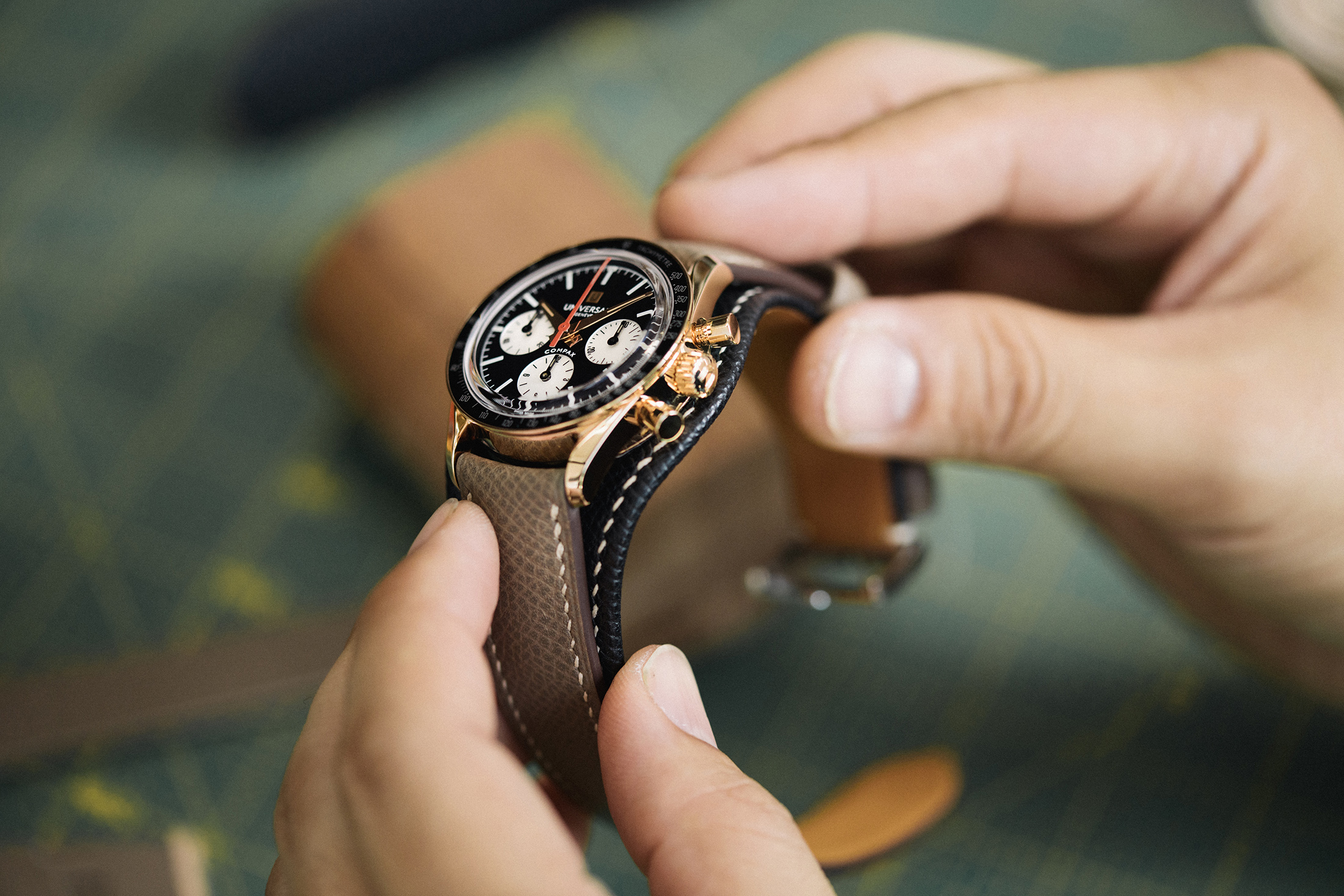 This time, Universal has gone the extra mile with the Bund strap, a possible foreshadowing of the brand’s direction in the upcoming years. They’ve tapped one of the world’s greatest leatherworkers, Satoru Hosai, to craft the straps. Hosai is well-known in his sphere of influence. He moved from Japan to Italy and eventually to Paris, where he worked for Hermès for eleven years before joining Moynat and then starting his own company in 2020. Hosai essentially works alone to produce around 25 bags a year, going so far as to make his own hardware. He is known to be meticulous and camera-shy, and the order book goes on for years. However, one thing he has never done before this collaboration is make watch straps. These are truly unique, bespoke pieces, meant to match their specific watch.