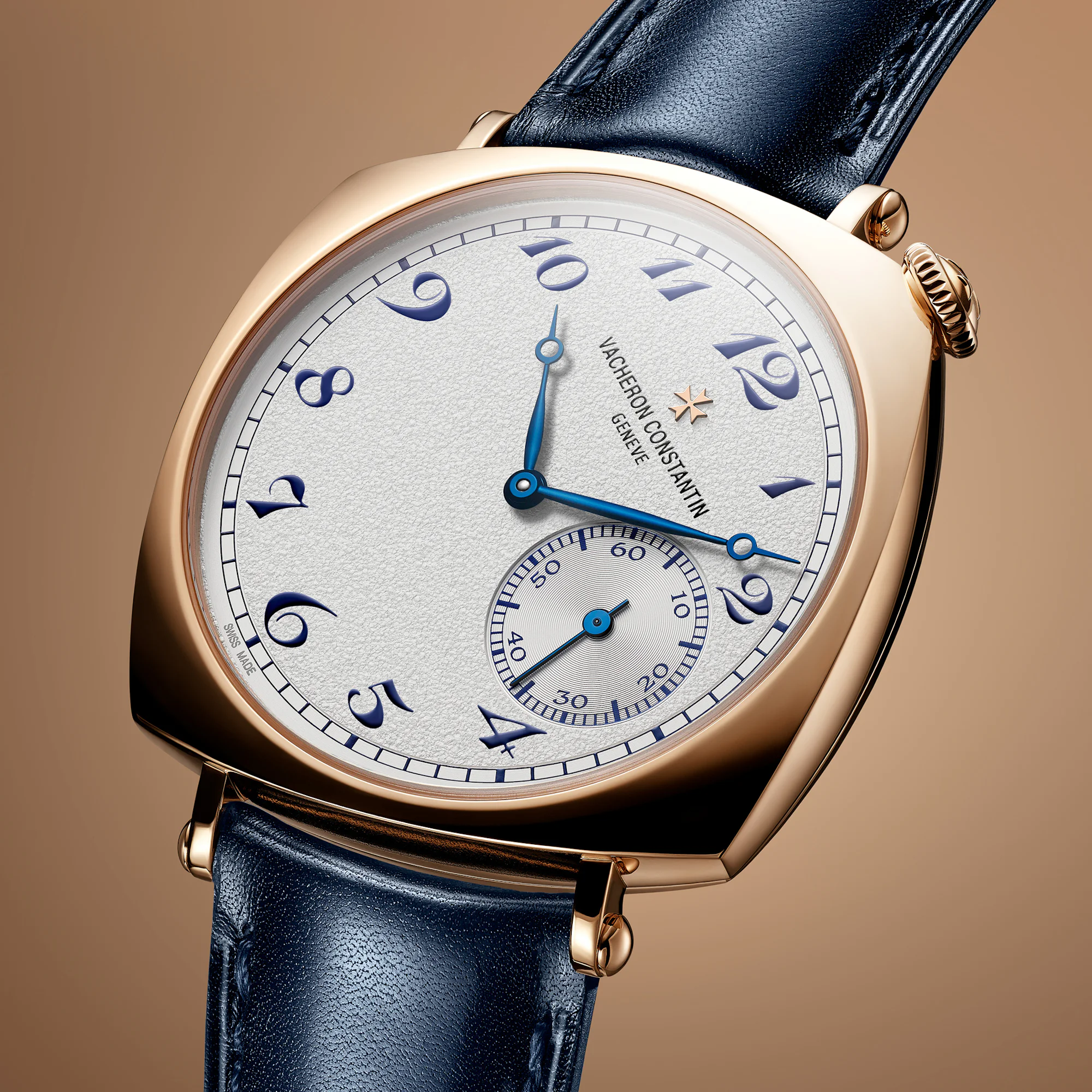 Indexes: Blue Arabic numerals and minutes track; Applied Maltese cross in polished 18K 5N pink gold