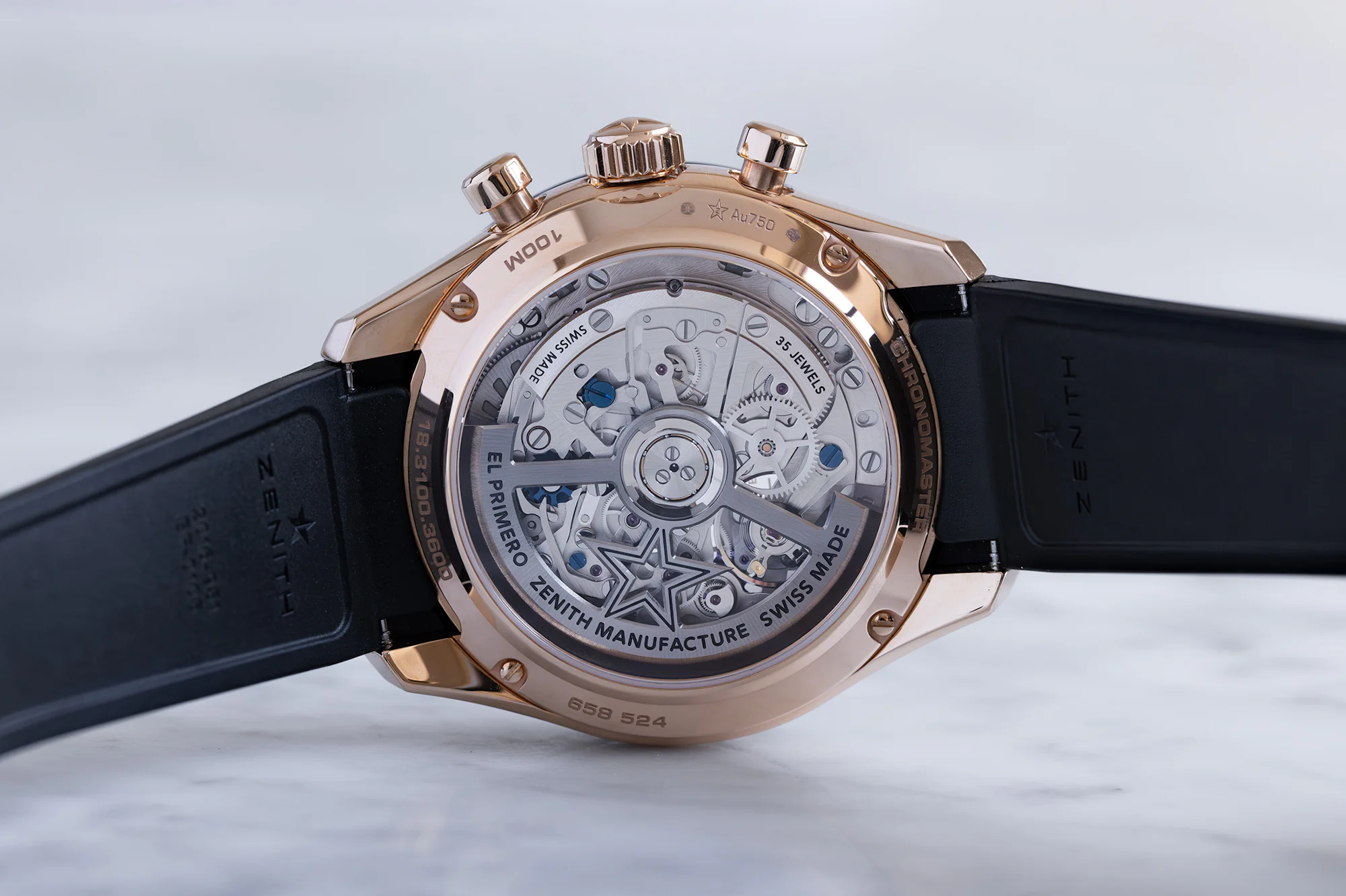 Layout stays the same: hours and minutes in the center, small seconds at 9, date at 4:30, and the 1/10th of a second chronograph. That central chronograph hand still makes one full rotation every 10 seconds, powered by the El Primero 3600, providing a 60-hour power reserve, visible through the caseback.