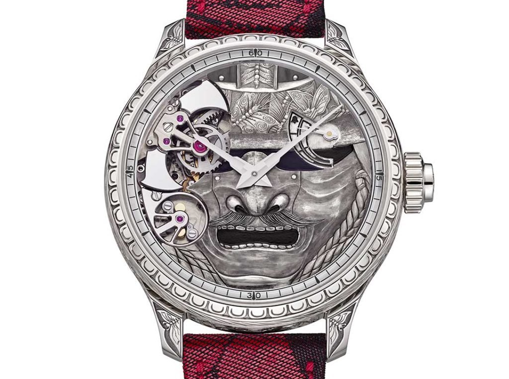 Medieval novels, urban thrillers, period series adorning traditional costumes and chronicles of modern-day Japan, elaborate flavors and scenery beyond compare… The Land of the Rising Sun fascinates more than ever with its rich diversity and its cultural expressions. Watchmaking hasn’t been forgotten either, as seen through Chopard‘s L.U.C Full Strike Spirit of the Warrior watch. Its dial is embellished with a hand-engraved Samurai mask inspired by the ones worn during the Edo era (1603-1868). The hour and minute hands, as sharp as katanas, hover over a railway-type minute tracker transferred unto the sapphire crystal using a decal. The scenography surprises with its opening at 10 o’clock which reveals a mysterious mechanism. A tap on the discreet chiseled pusher integrated in the crown triggers the hammers of a minute repeater to chime the hours, quarters, and minutes.