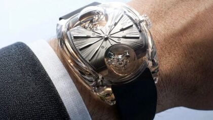 The faceted indexes and diamond-cut, faceted hands are coated with Super-LumiNova to ensure optimal readability, well protected by a domed sapphire crystal with anti-reflective coating on both sides.