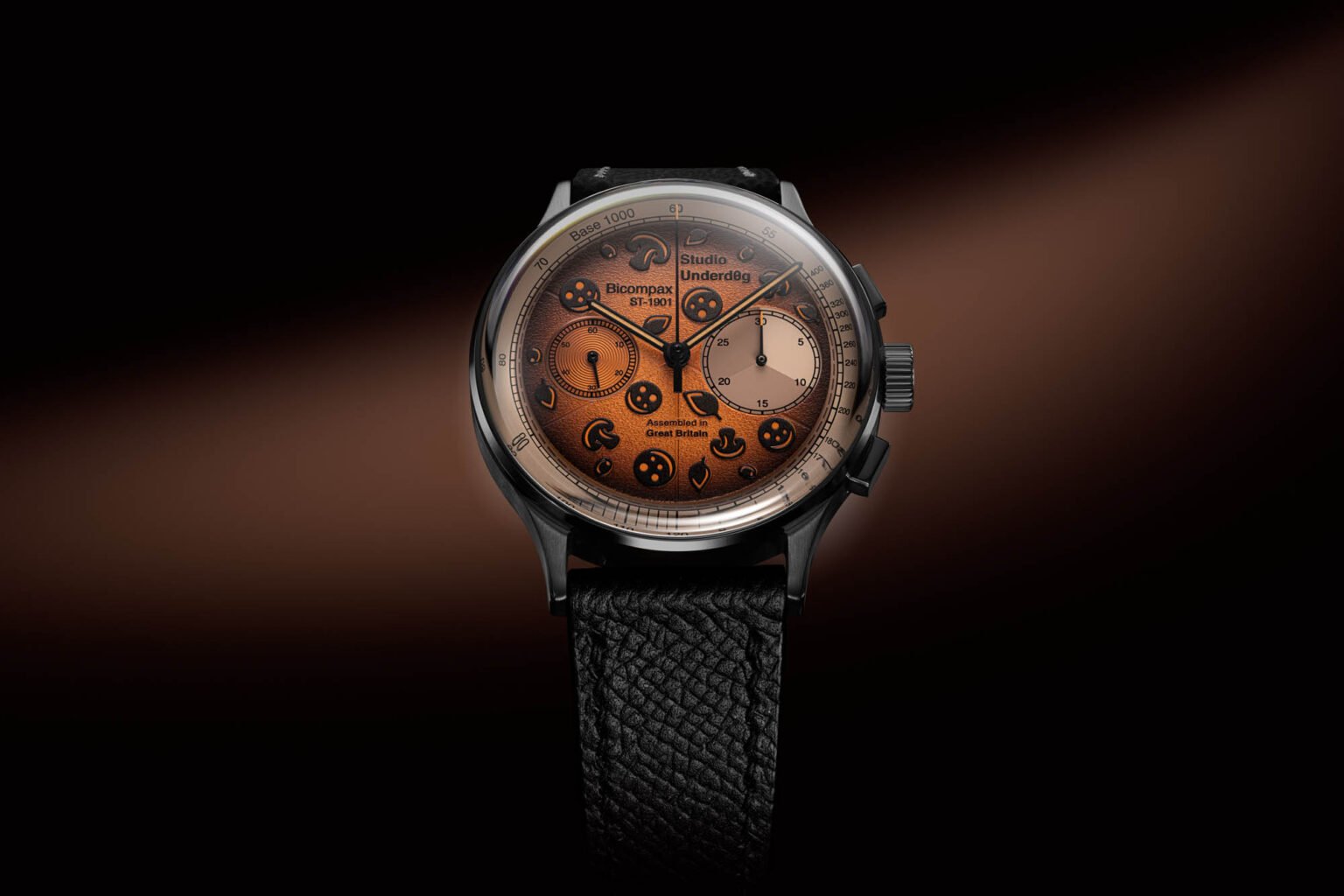 First, there’s Burnt Pepper0ni, a crispy upgrade to the original Pepper0ni model. While you may think this watch is understated at first glance, the real wit of Studio Underd0g comes through upon further inspection. Yes, the PVD-coated black case may look subtle, but with a few toppings, including mushrooms, basil leaves, and pepperoni, decorating the red textured dial, this watch is hardly subtle in its execution of the theme. The Burnt Pepper0ni comes with either a black leather strap from The Strap Tailor or a PVD-coated Milanese mesh bracelet.