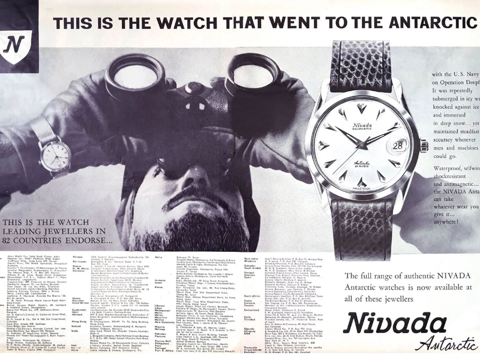 Nivada Grenchen (the “Grenchen” was officially added to the brand name after litigation by Movado, which was concerned about the phonetic similarity) introduced one of its most important models in 1950, a rugged, antimagnetic diver’s watch eventually called the Antarctic. From 1955 to 1956, U.S. Navy Admiral Richard Byrd led “Operation Deep Freeze,” a military-backed scientific mission to establish permanent bases in Antarctica. Bird’s crew members wore Nivada Grenchen Aquamatic watches (which were swiftly re-branded “Antarctic”) on the mission, subjecting the timepieces to sub-zero temperatures and all the other harsh conditions of polar exploration. By continuing to run reliably and accurately during this period, the Antarctic secured its place in tool-watch history.