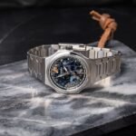 In 2019, Omega made history (and scored a win in its longtime battle with rival Rolex for dive-watch record supremacy) when a prototype watch called the Seamaster Planet Ocean Ultra Deep Professional descended more than 10,928 meters (or 35,853 feet) into the Marianas Trench on an undersea expedition headed by ocean explorer Victor Vescovo. That feat bested the previous record of 35,787 feet, set in 2012 by the Rolex Deepsea model that accompanied director James Cameron in his Challenger Deep expedition, and thus established Omega (for a time) as the maker of the world’s most water-resistant watch. The prototype, made of titanium and measuring a hulking 55 mm in diameter and 28 mm thick, was not really made to be worn as a wristwatch, but in 2022, Omega introduced a more wearable version called the Planet Ocean Ultra Deep. The cases, one version in grade 5 titanium like the prototype, six others in a new alloy called O-megasteel, were downsized to 45.5 mm in diameter and 18.2 mm thick — still large, but more wrist-friendly than their predecessor — and offered a still-robust water-resistance of 6,000 meters. Each watch is tested to 7,500 meters — not as punishing a level of pressure as the more than 10,000 meters the prototype endured, but certainly at the upper echelon of underwater toughness for a watch. That watch’s no-date dial design, and several other technical upgrades, are among the elements that informed the fourth and most recent generation of the Planet Ocean, which brings us to our subject at hand.