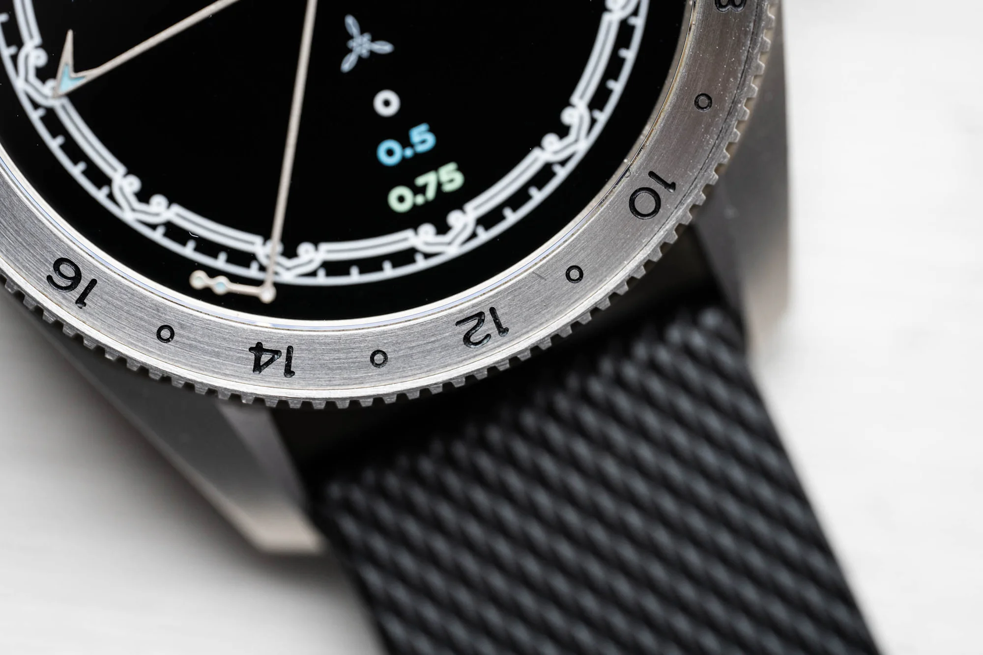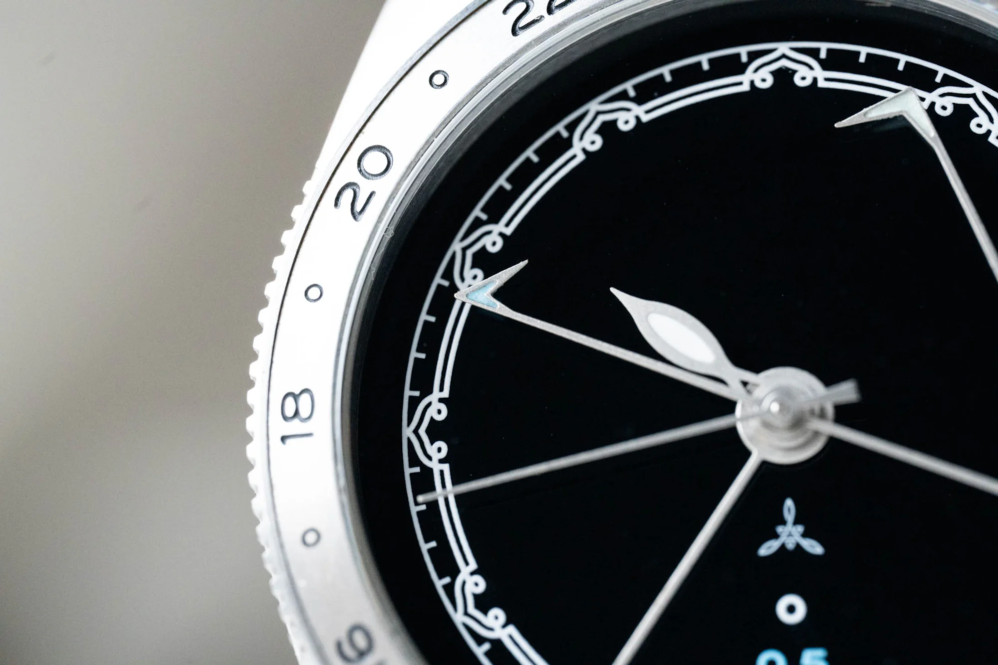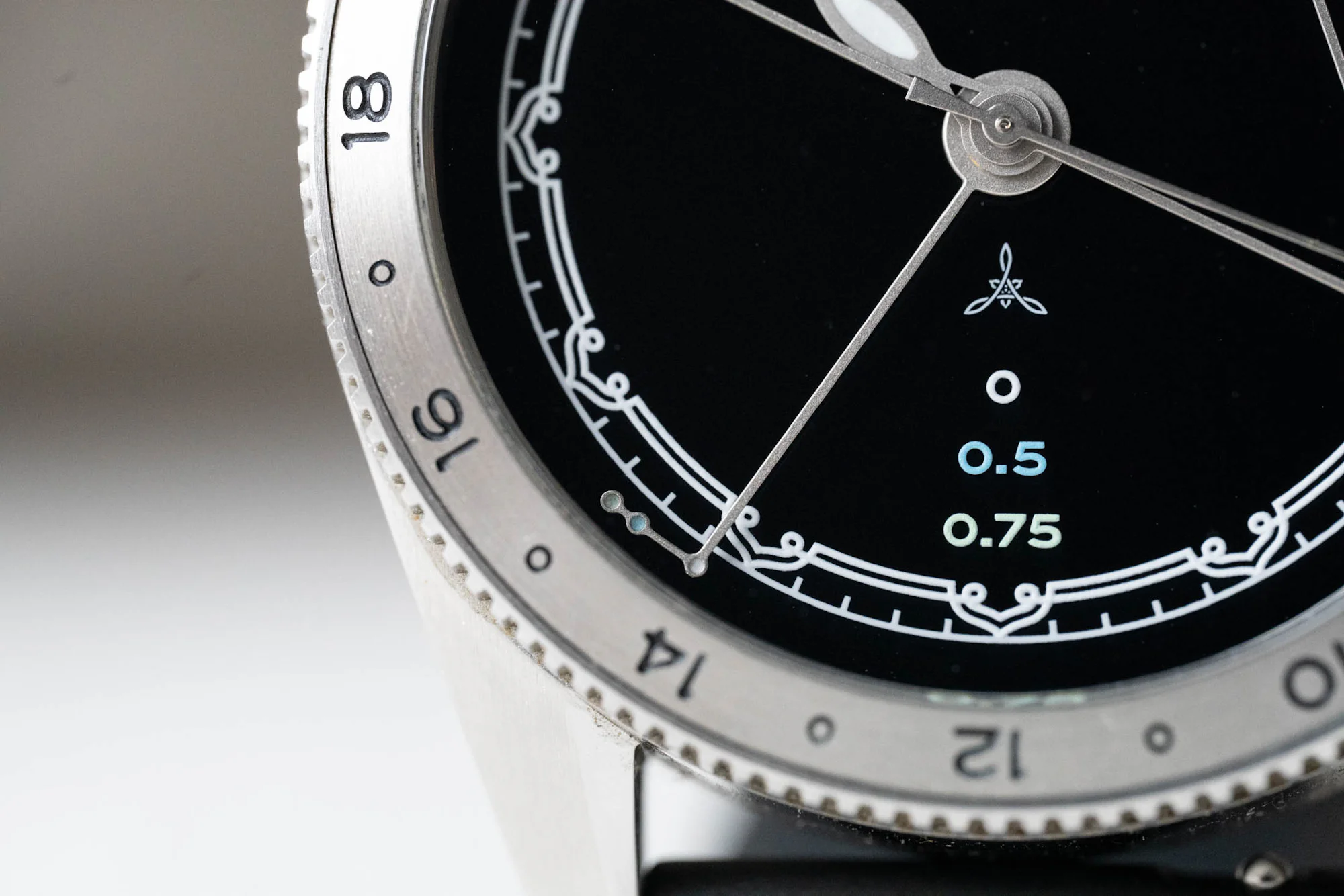 All of the Super-LumiNova felt quite uniform on the handset, even though it’s hand-applied, a great detail for a microbrand’s first entry. The hands sit atop a deep, glossy black dial, with the Ardra Labs logo printed above the colored (and lumed) scale for the time shifts of the minute hand(s). The minutes track features an incredibly tastefully executed decorative motif that draws on Krishnan’s Indian heritage and inspirations. It’s a great example of restraint in the design, with enough whimsy here to complement the unconventional handset, but nothing more.