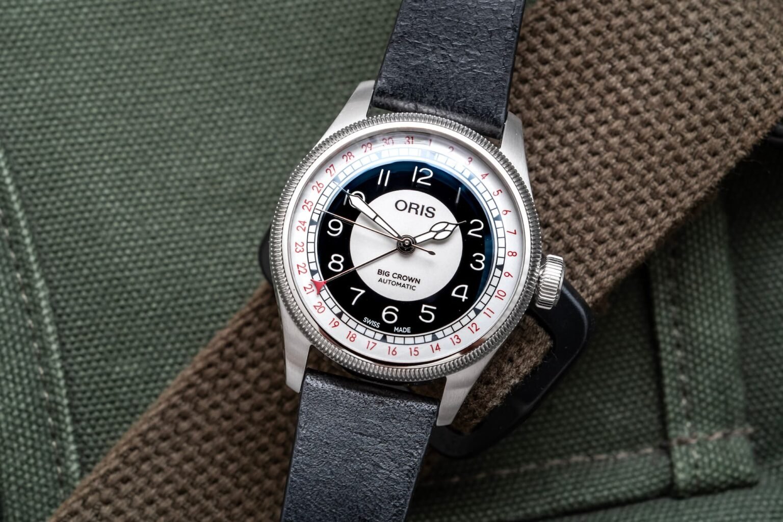 oris big crown pointer date bullseyeWhile much of its modern output is devoted to sport-oriented timepieces, like the popular Aquis and Divers (formerly Divers Sixty-Five) diving watches, the brand’s most recognizable and emblematic collection is the Big Crown Pointer Date, which has been a mainstay of the brand’s portfolio — and in constant production — since 1938. It was the first watch with a date indication displayed via a central hand on an outer scale, and it took the other part of its model name from its signature design element — an oversized crown that offered ease of use for its intended audience, pilots who wore thick gloves in the cockpit.The “Big Crown” designation has since migrated to other collections that don’t feature this rare, analog date function, but the 88-year-old original version still takes pride of place in Oris’ wide and versatile collection.