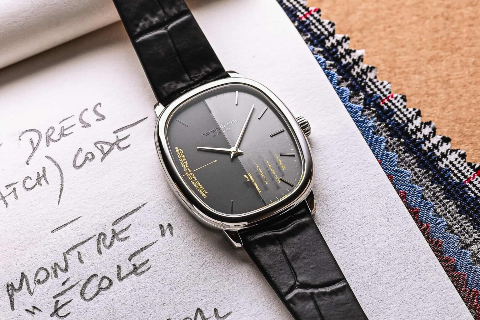 Raymond Weil’s Toccata Heritage Seconde/Seconde edition is the fruits of a collaboration between the independent Swiss watchmaker and designer Romaric Andre, known for his playful customization of watch dials. This latest iteration of the brand’s oval-cased dress watch — its name drawn from the world of classical music, a passion of the brand’s eponymous founder — is described as a “horological Simon Says:” its dial is divided into two different shades of anthracite gray, with Dauphine hands in the center, each inscribed with fashion-forward “dress codes” on how to wear the watch.