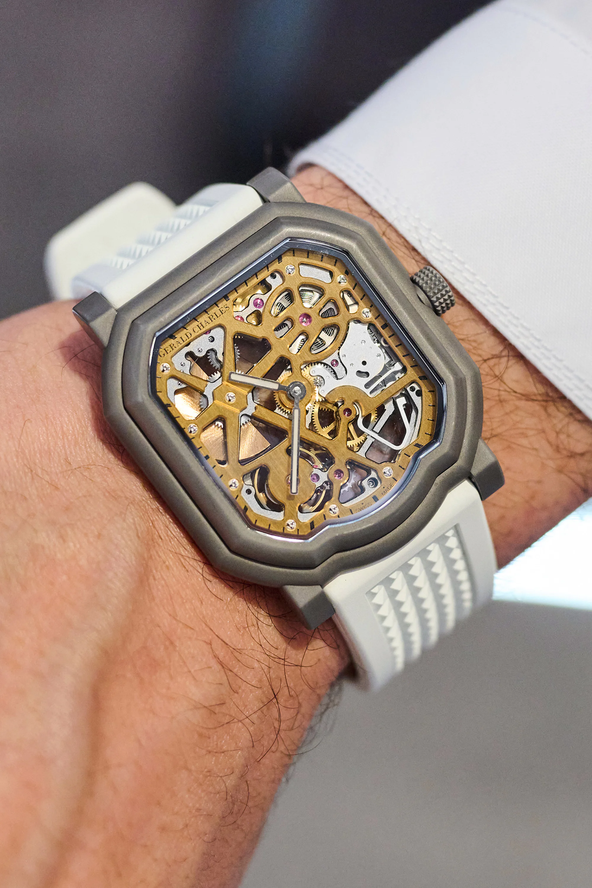 The coolest thing I saw at Dubai Watch Week was this fascinating 3D printed case for a mockup of the RD#5 movement. The left 8 o’clock position was a small wheel to wind the small power reserve, the balance was 5 o’clock. They put a strap on the case so they could test if the pushers would get triggered by the wrist movement.
