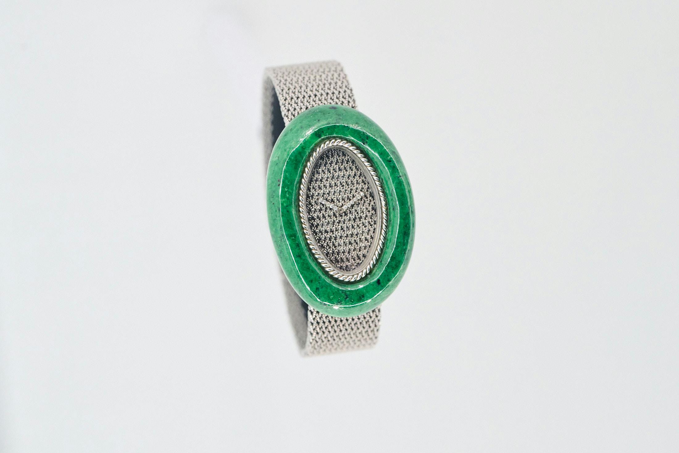 Here’s a watch that’s fascinating, not just for the garnet bezel and ellipse shape, but also because it was crafted to look like the mesh strap threads through the dial and hands.