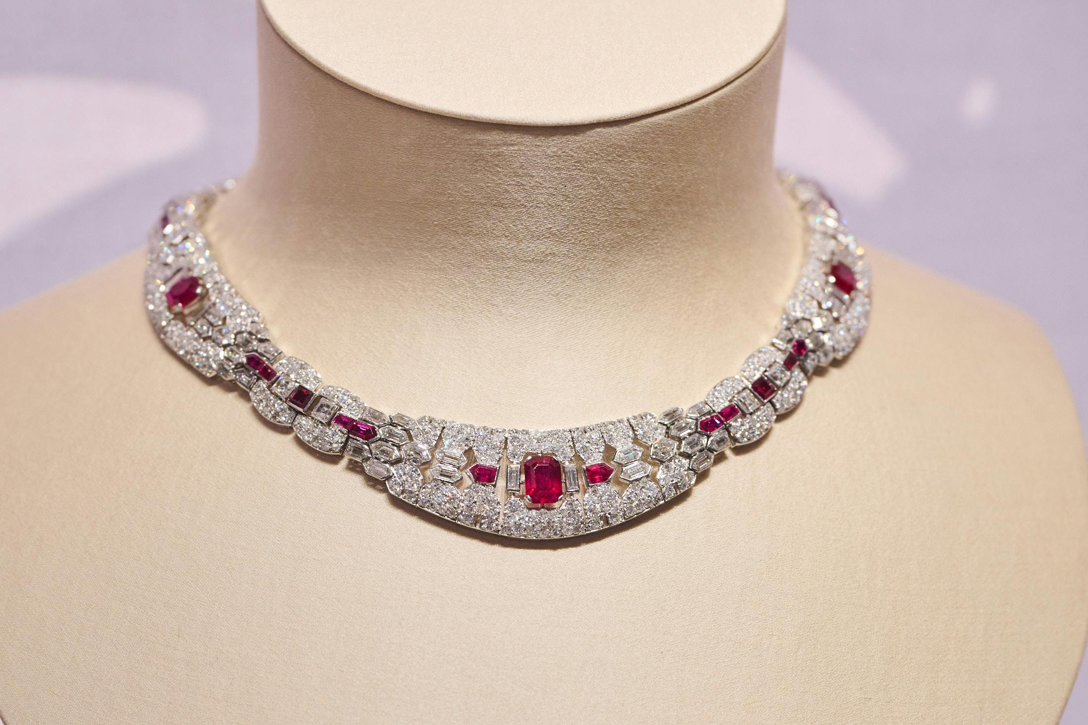 A collaret from 1936 in white gold, platinum, diamonds, and rubies.