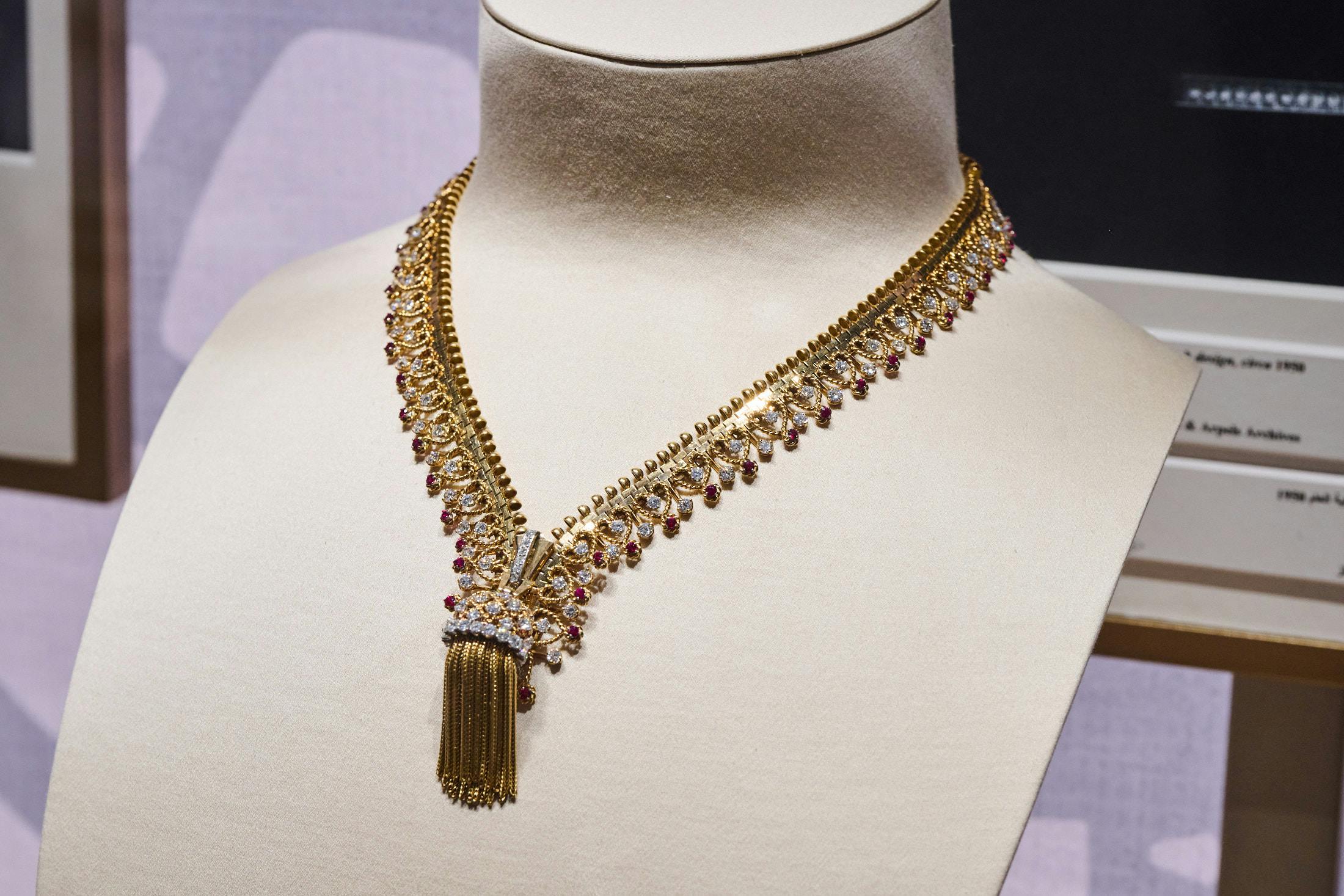 If you look closely, this necklace is made to look like a zipper and is transformable into a bracelet. It’s made in yellow gold, platinum, rose gold, rubies, and diamonds.