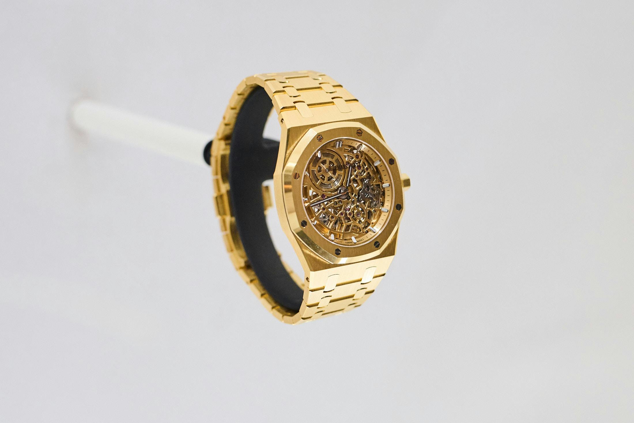 Two different versions of openworked watches, with the 16204BA “Jumbo” Royal Oak in yellow gold.