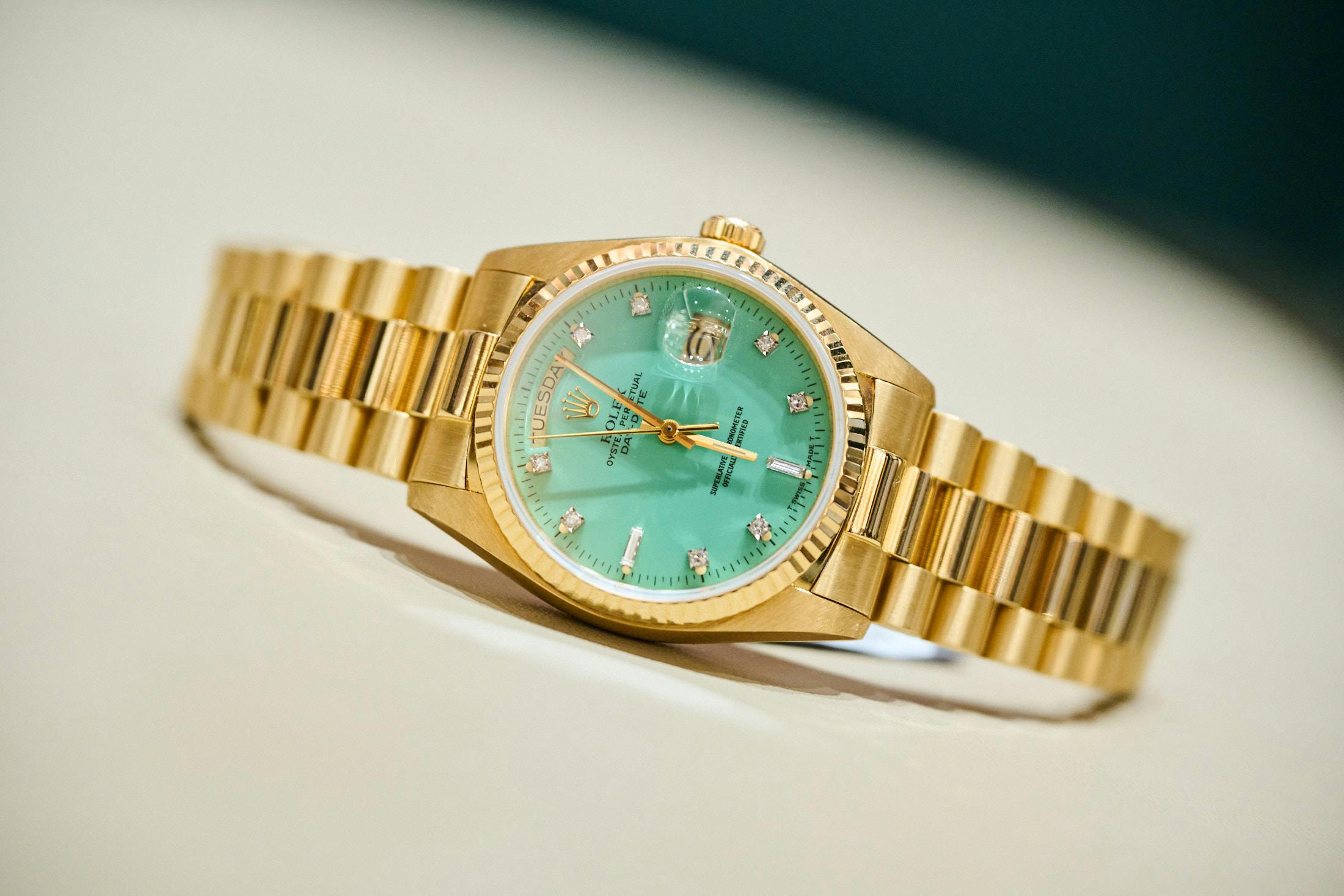 A yellow gold seafoam Stella Day-Date ref. 18038 with diamond indices.