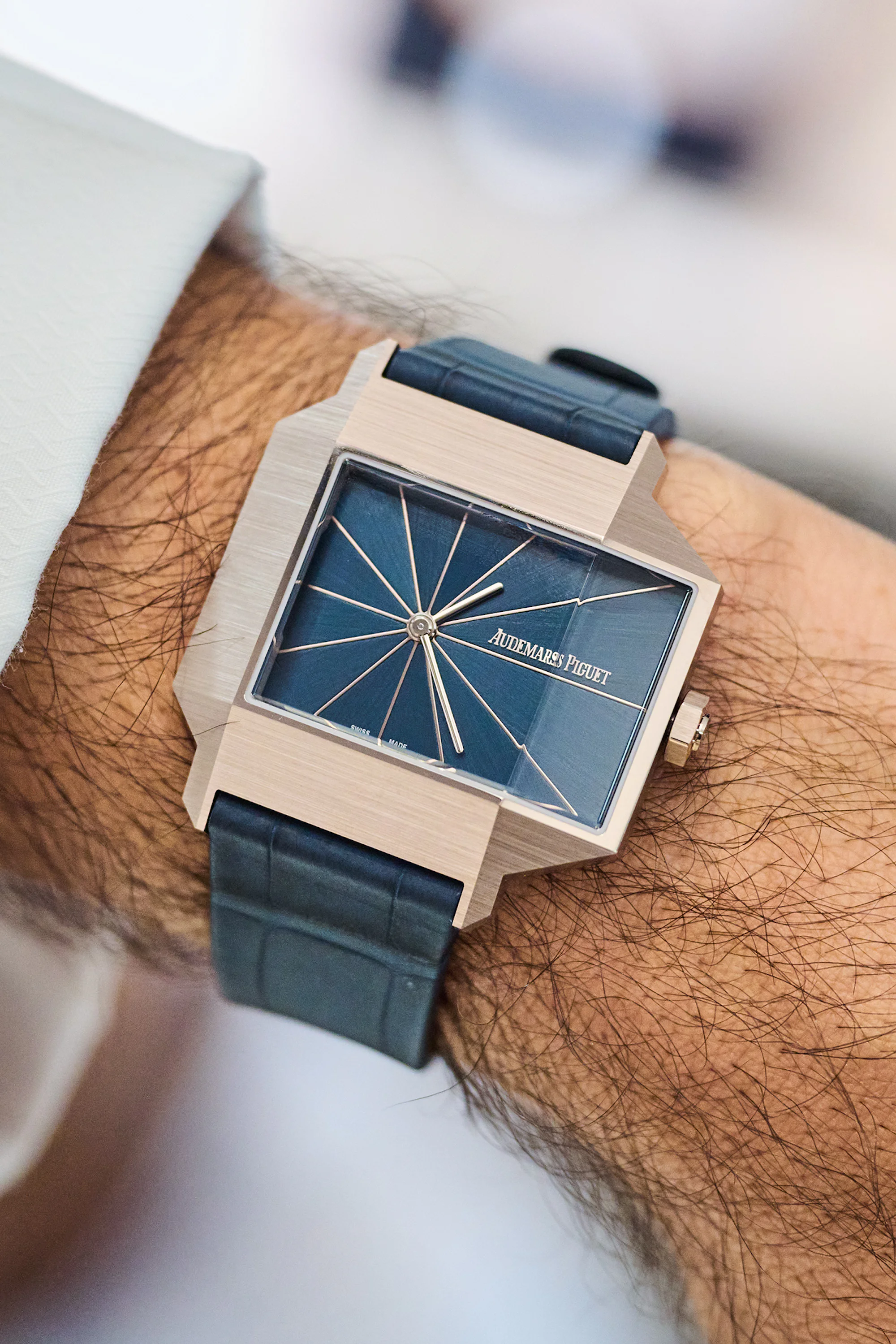 Mark Schmid of Audemars Piguet wearing one of the most legitimately interesting watches of the week, a vintage VZSS 13”’ movement in oversized case with an unusual quasi-sector dial.
