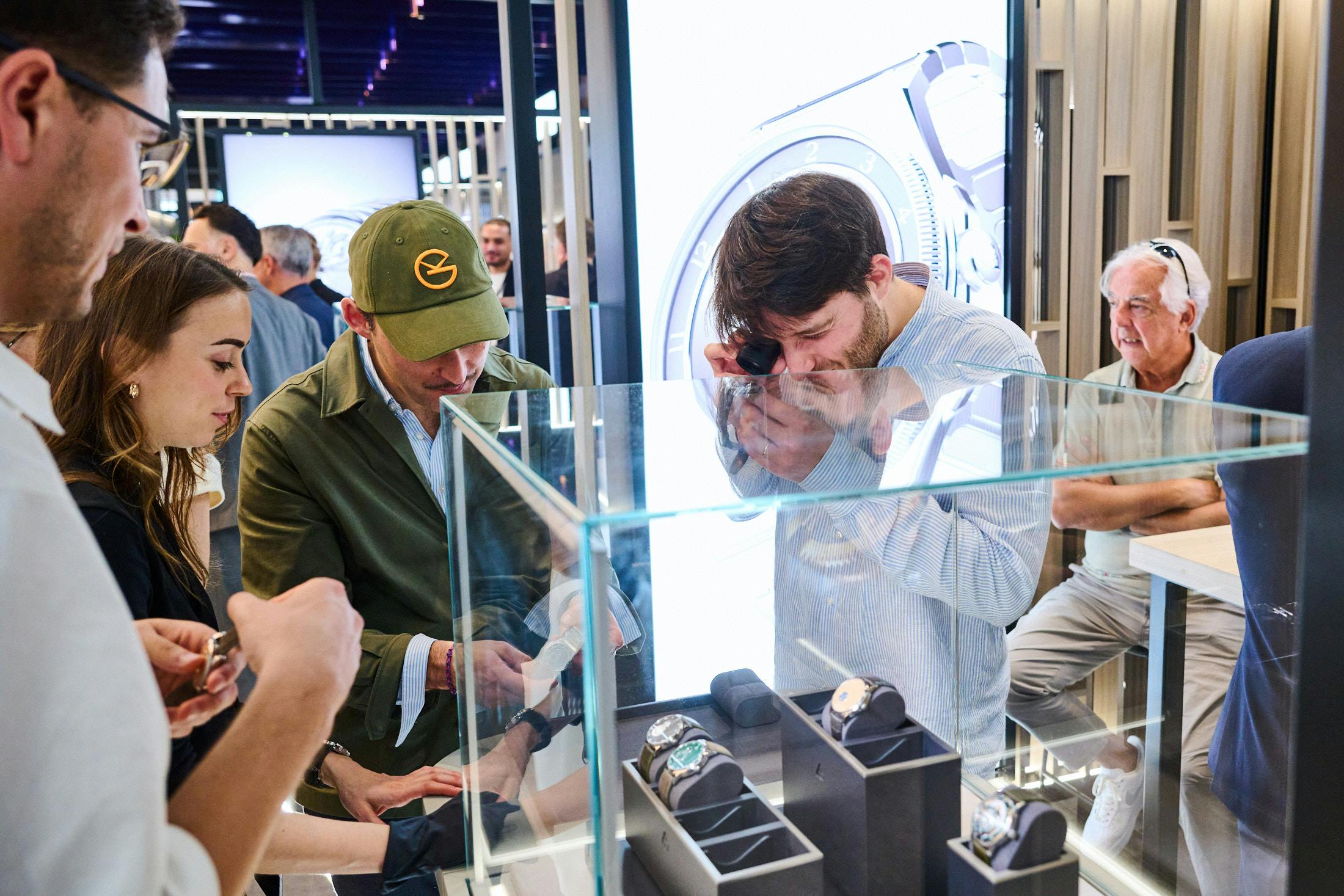 Gautier Massonneau, CEO of Trilobe, looking at a watch at his booth.